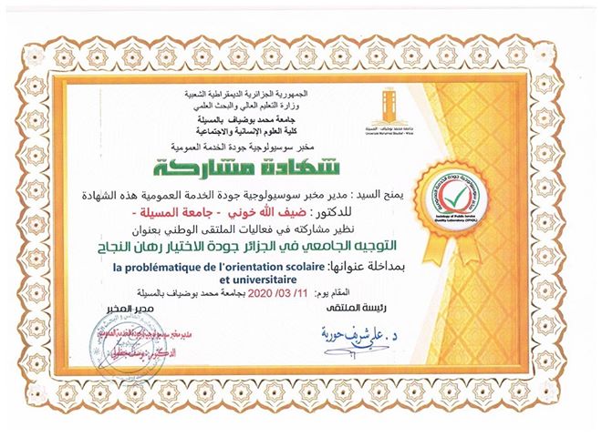 M. DIFFALAH Khaouni, (2020), "La problématique de l’orientation scolaire et universitaire", [national] التوجيه الجامعي في الجزائر جودة الاختيار رهان النجاح , مخبر سوسيولوجيةجودة الخدمة العمومية. جامعة المسيلة