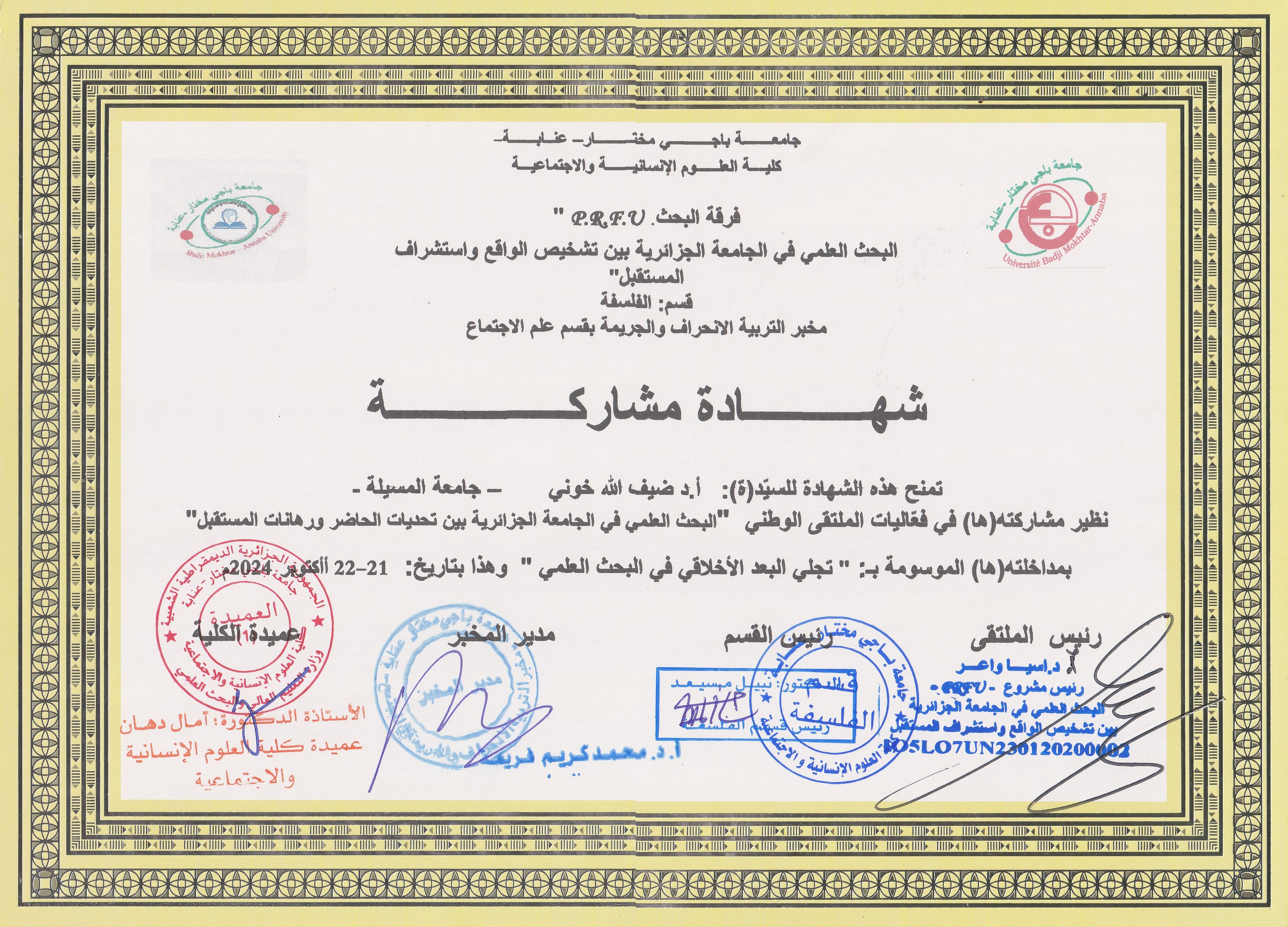 M. DIFFALAH Khaouni, (2024-10-21), "تجلي البعد الأخلاقي في البحث العلمي", [national] البحث العلمي في الجامعات الجزائرية بين تحديات الحاضر ورهانات المستقبل , جامعة باجي مختار عنابة