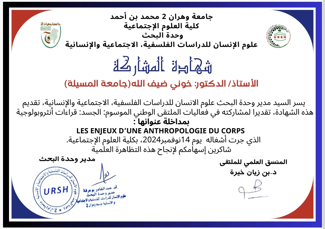 M. DIFFALAH Khaouni, (2024-11-14), "Les enjeux d'une anthropologie du corps", [national] الجسد: قراءات أنثروبولوجية , جامعة وهران2 محمد بن أحمد