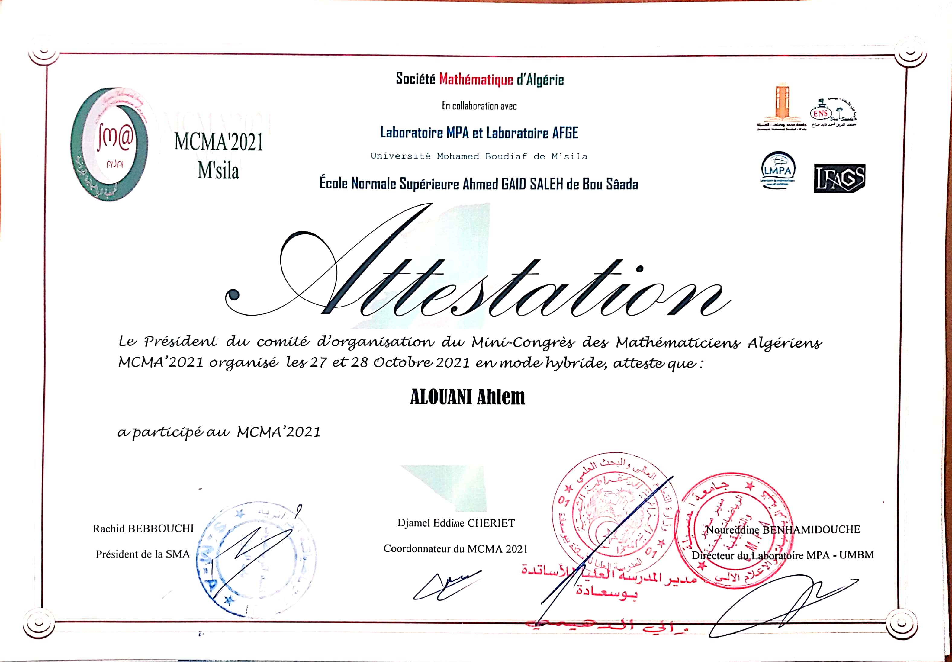 M. ALOUANI Ahlem, (2022), "Duality and factorable strongly p-nuclear m-homogeneous polynomials", [national] Rencontre d’Analyse Mathématique et ses Applications , Université de M’sila