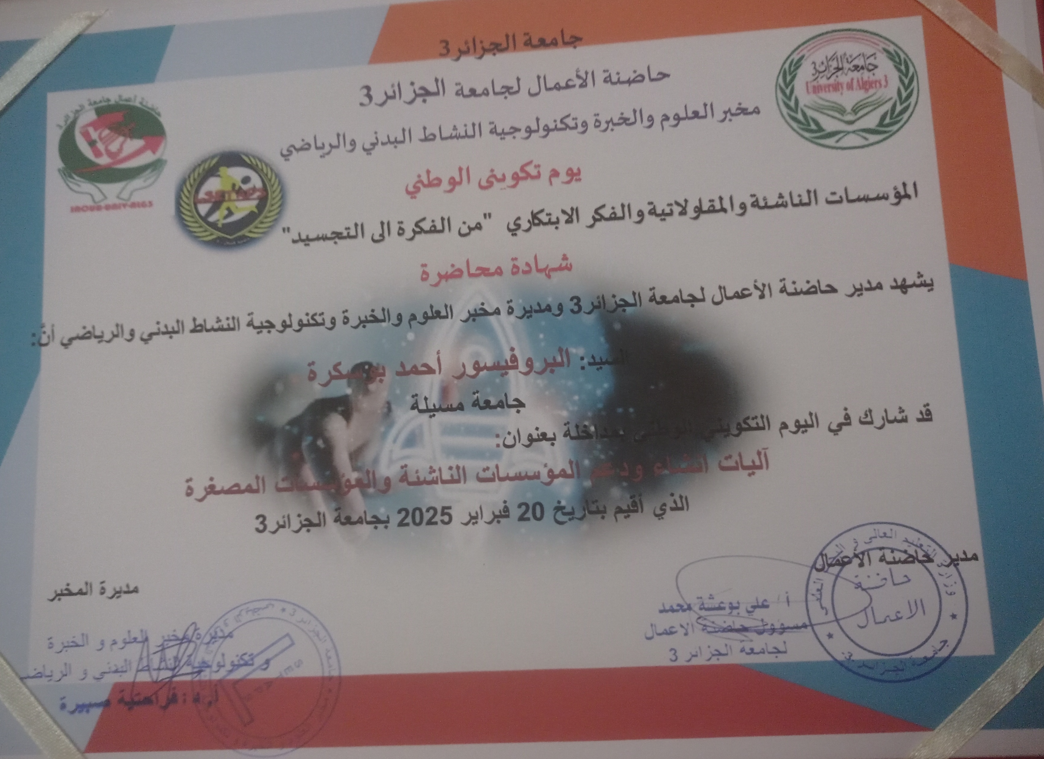 M. BOUSEKRA Ahmed, (2024-03-02), "المؤسسات الناشئة في الميدان الرياضي "نحو بيئة للاستثمار الرياضي في الجزائر"", [national] كيف تعد مشروعا مبتكرا من الفكرة الى التجسيد ؟ , 2جامعة سطيف