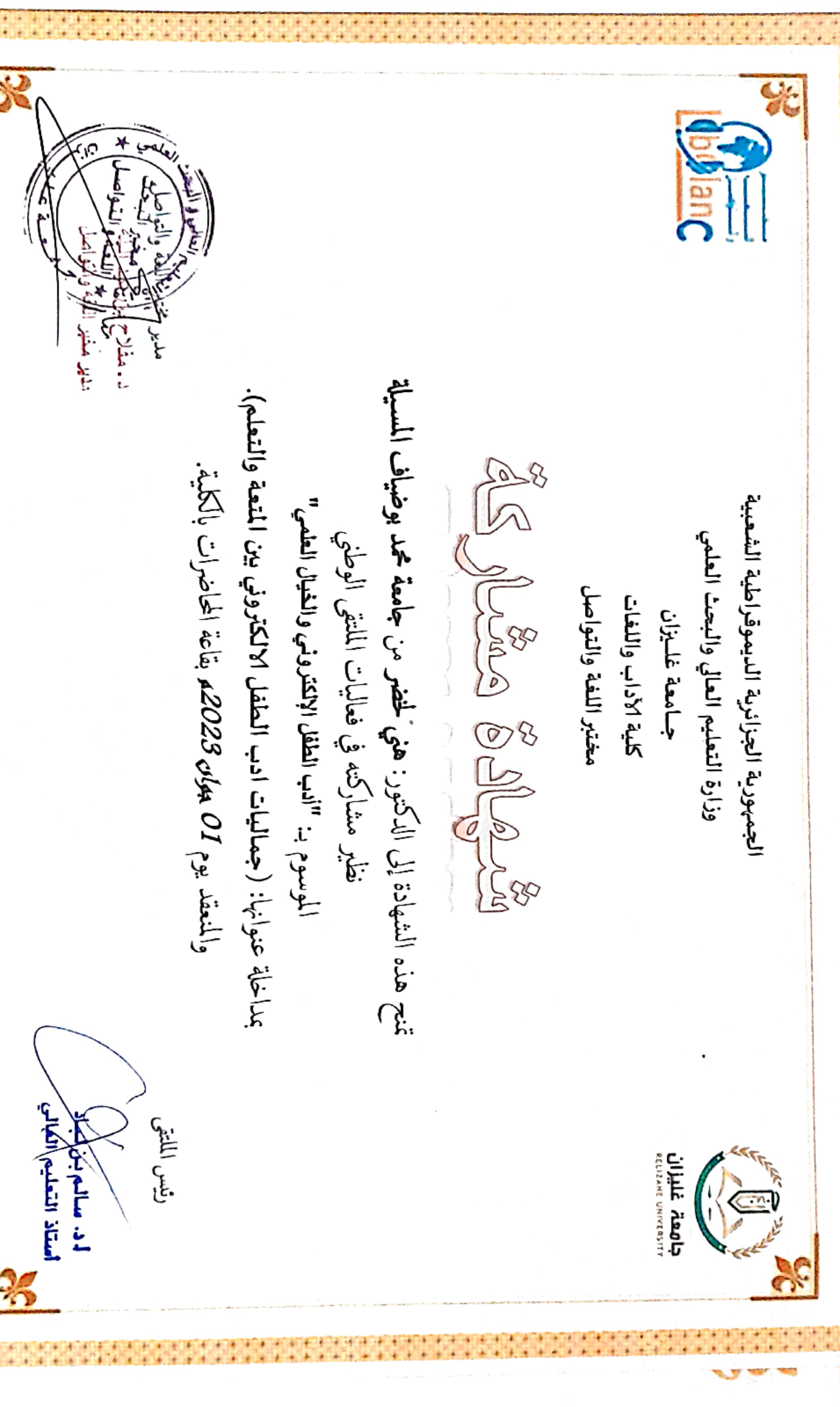 M. HENNI Lakhdar, (2023-06-01), "جماليات أدب الطفل الإلكترونيبين المتعة والتعلم", [national] أدب الطفل الإلكترونيوالخيال العلمي , غليزان/الجزائر