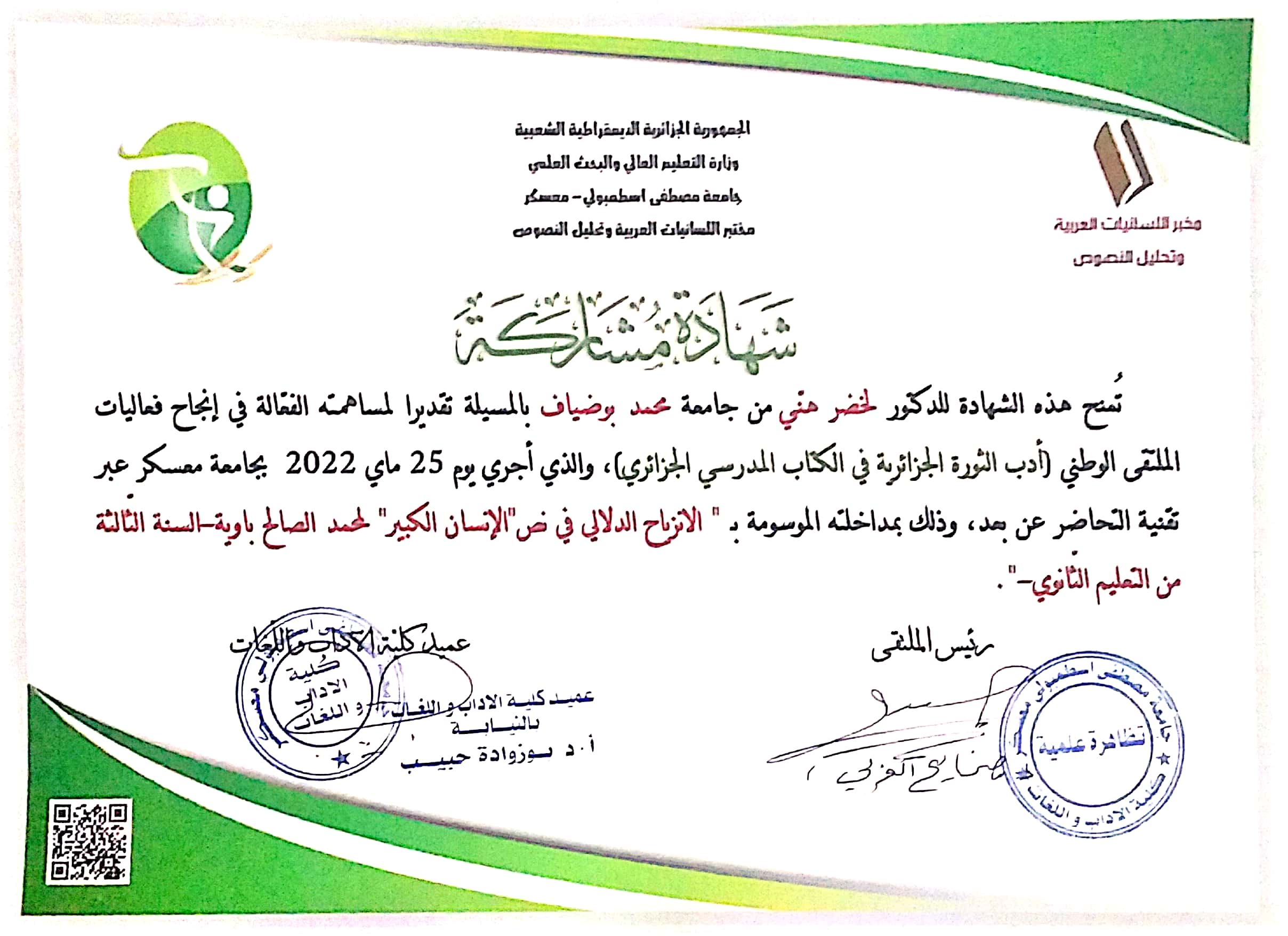 M. HENNI Lakhdar, (2022-05-25), "الانزياح الدلالي في شعر محمد صالح باوية", [national] أدب الثورة الجزائرية في الكتاب المدرسي الجزائري , معسكر/الجزائر
