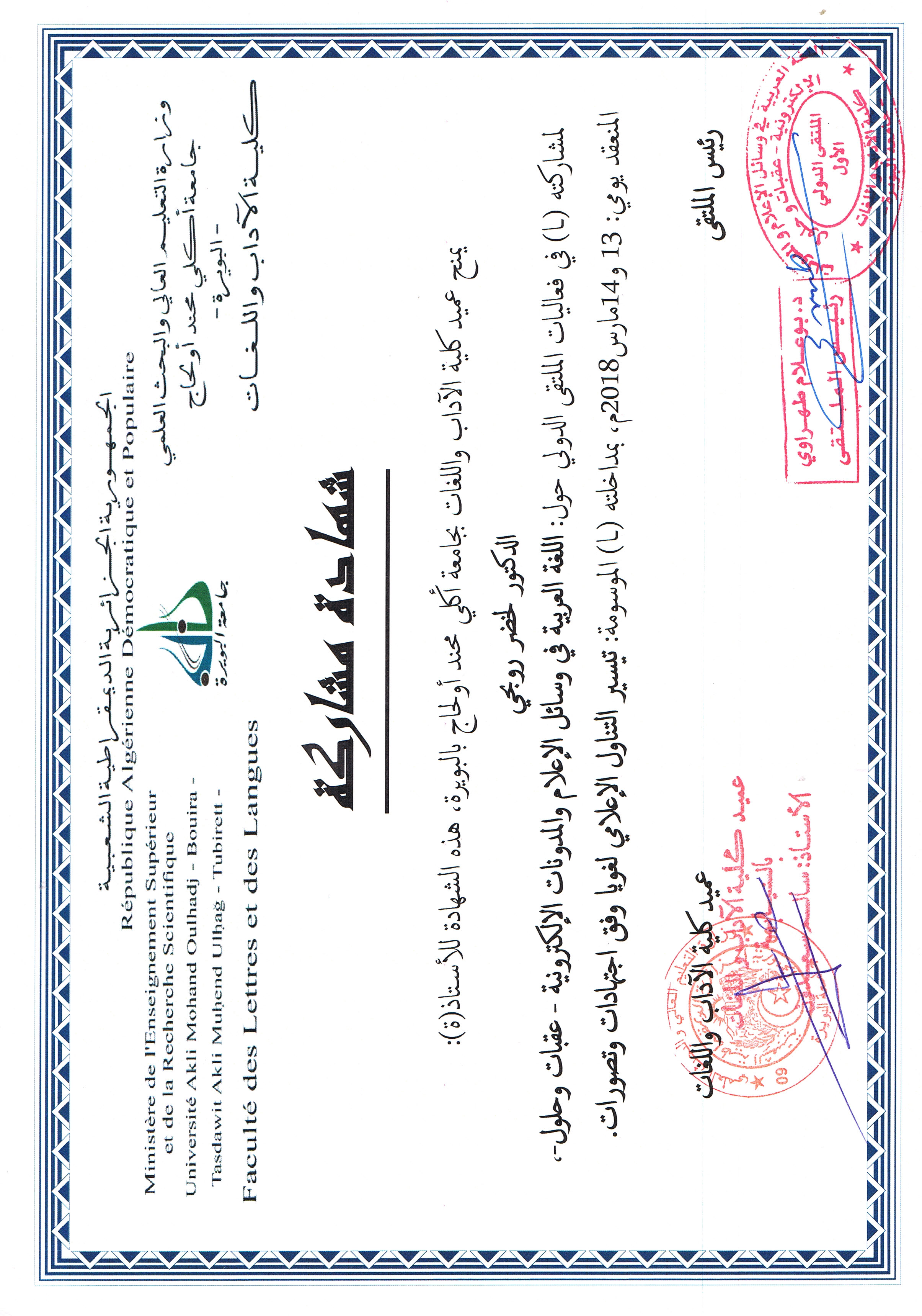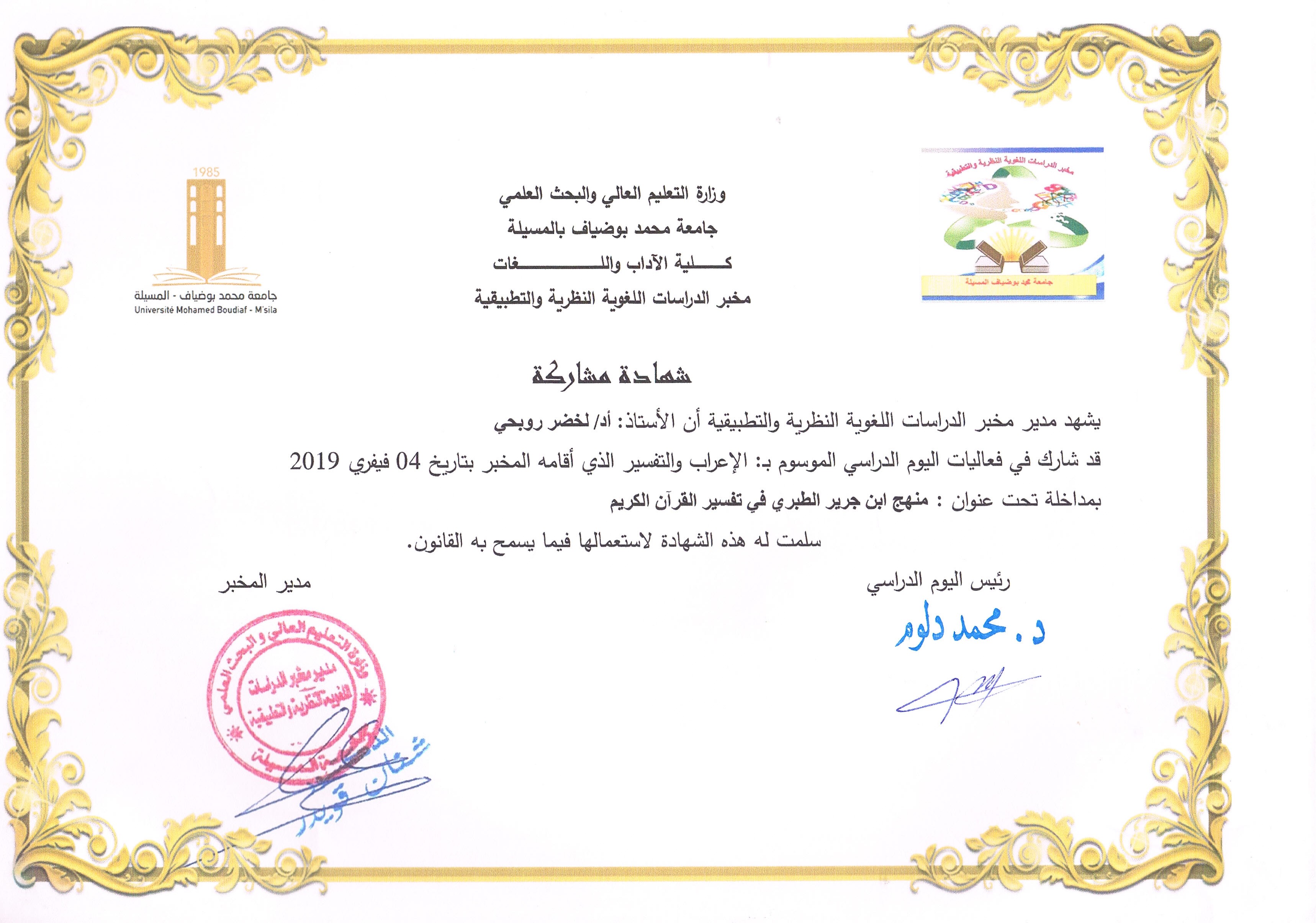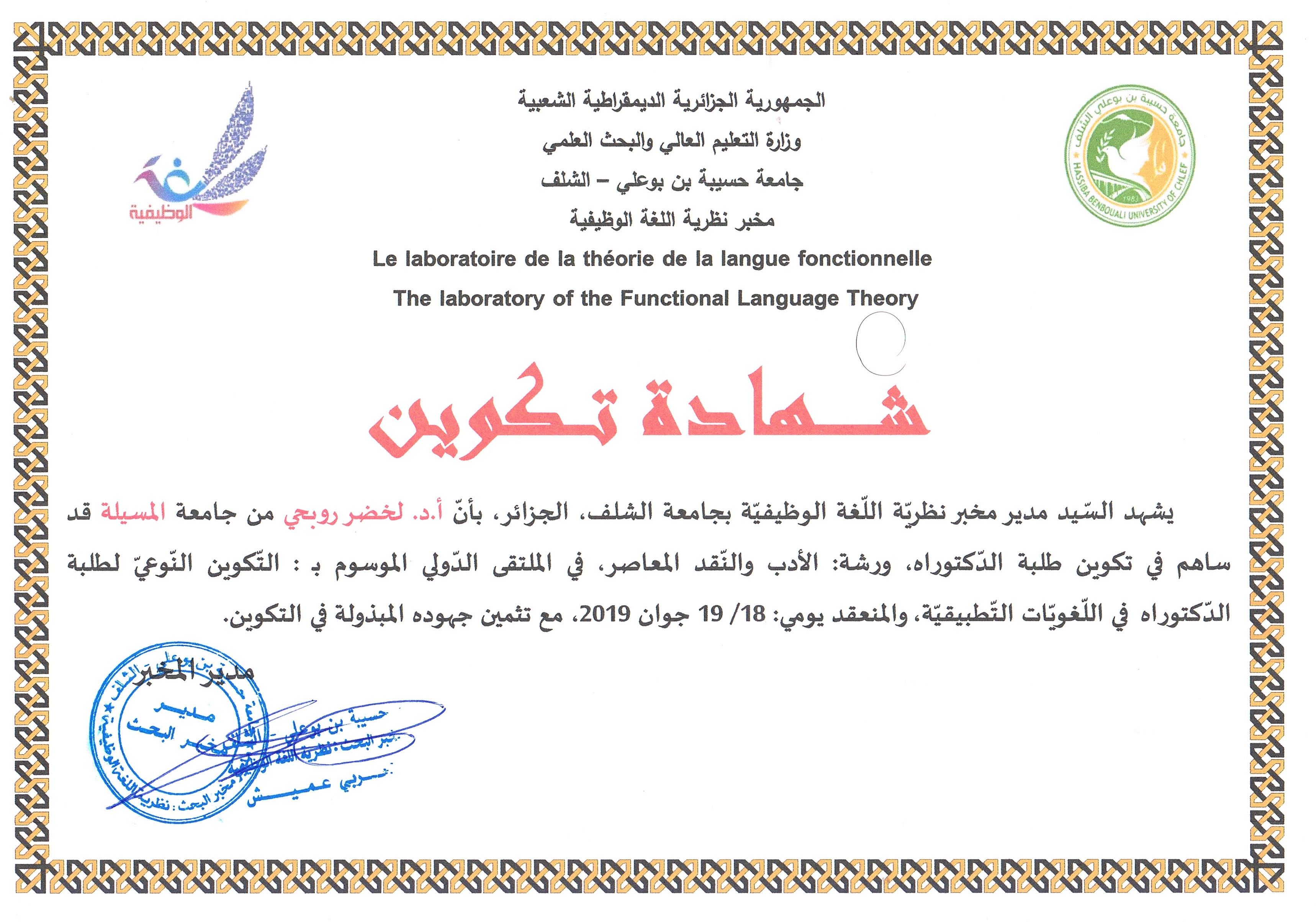 M. ROUBHI Lakhdar, (2019), "التكوين النوعي لطلبة الدكتوراه في الدراسات البينية", [international] التكوين النوعي لطلبة الدكتوراه في اللغويات التطبيقية , جامعة الشلف