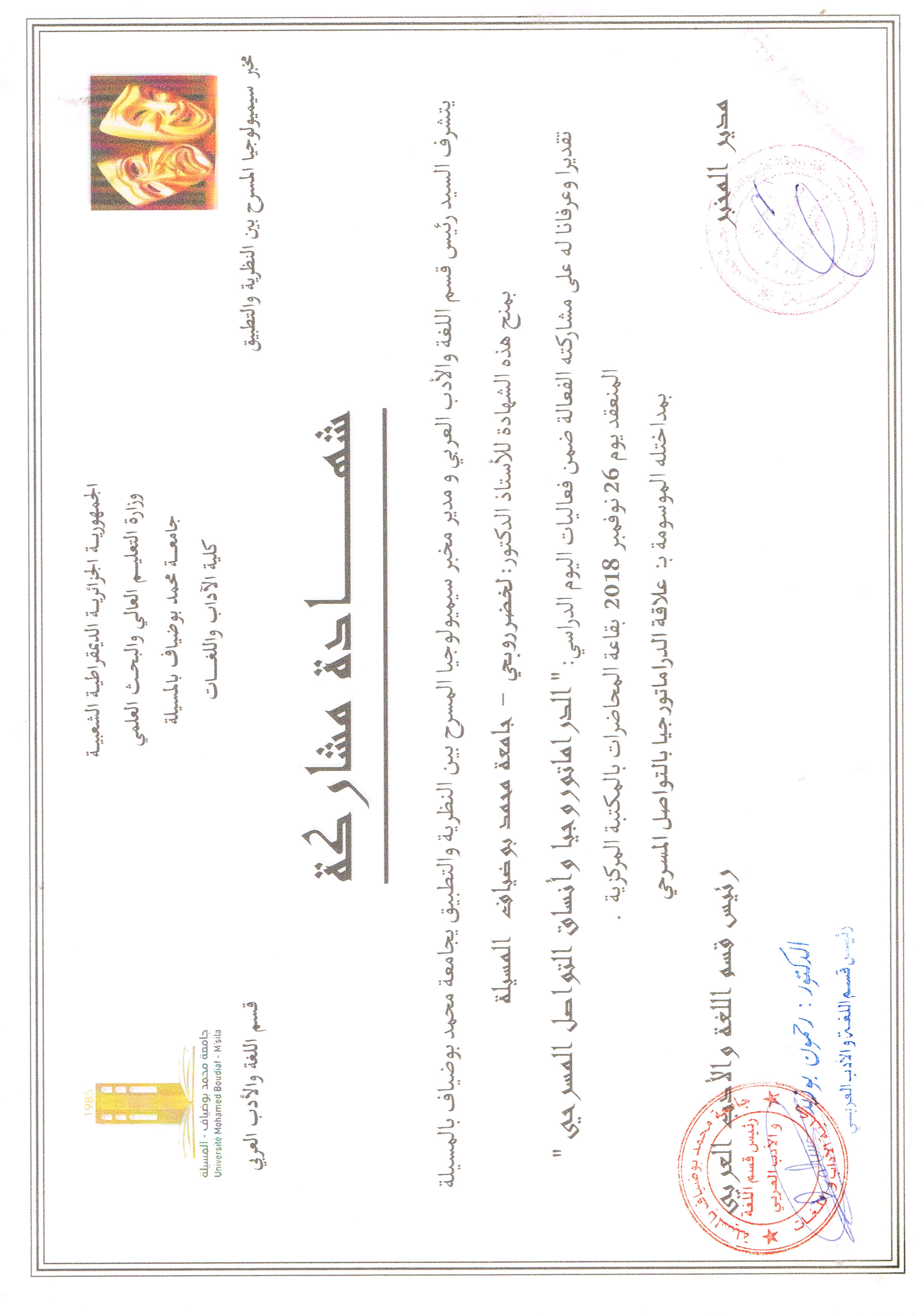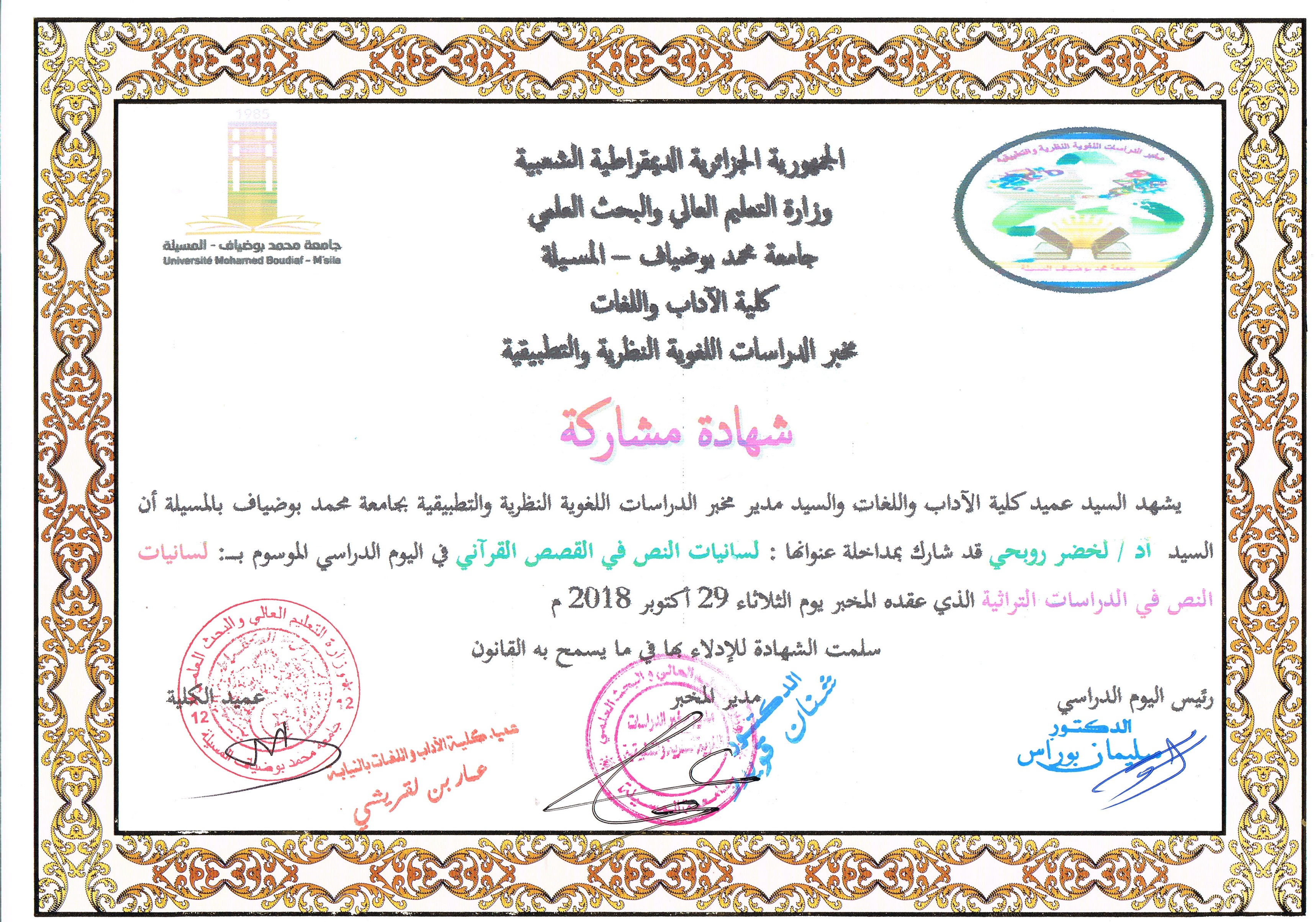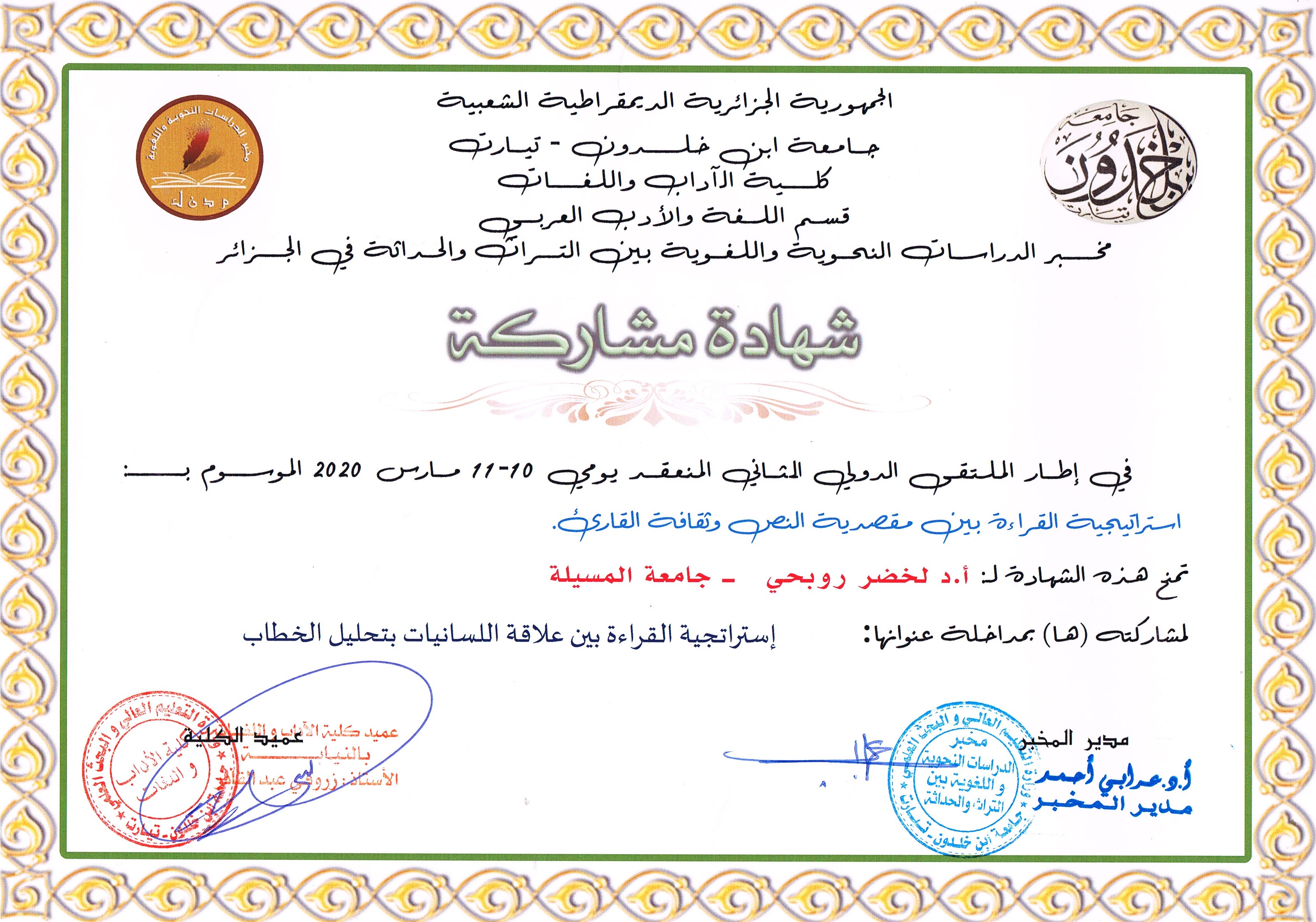 M. ROUBHI Lakhdar, (2019), "ثنائية التشكيل اللغوي في الخطاب المسرحي بين العامي والفصيح", [national] جماليات التشكيل اللغوي في الخطاب المسرحي , جامعة المسيلة