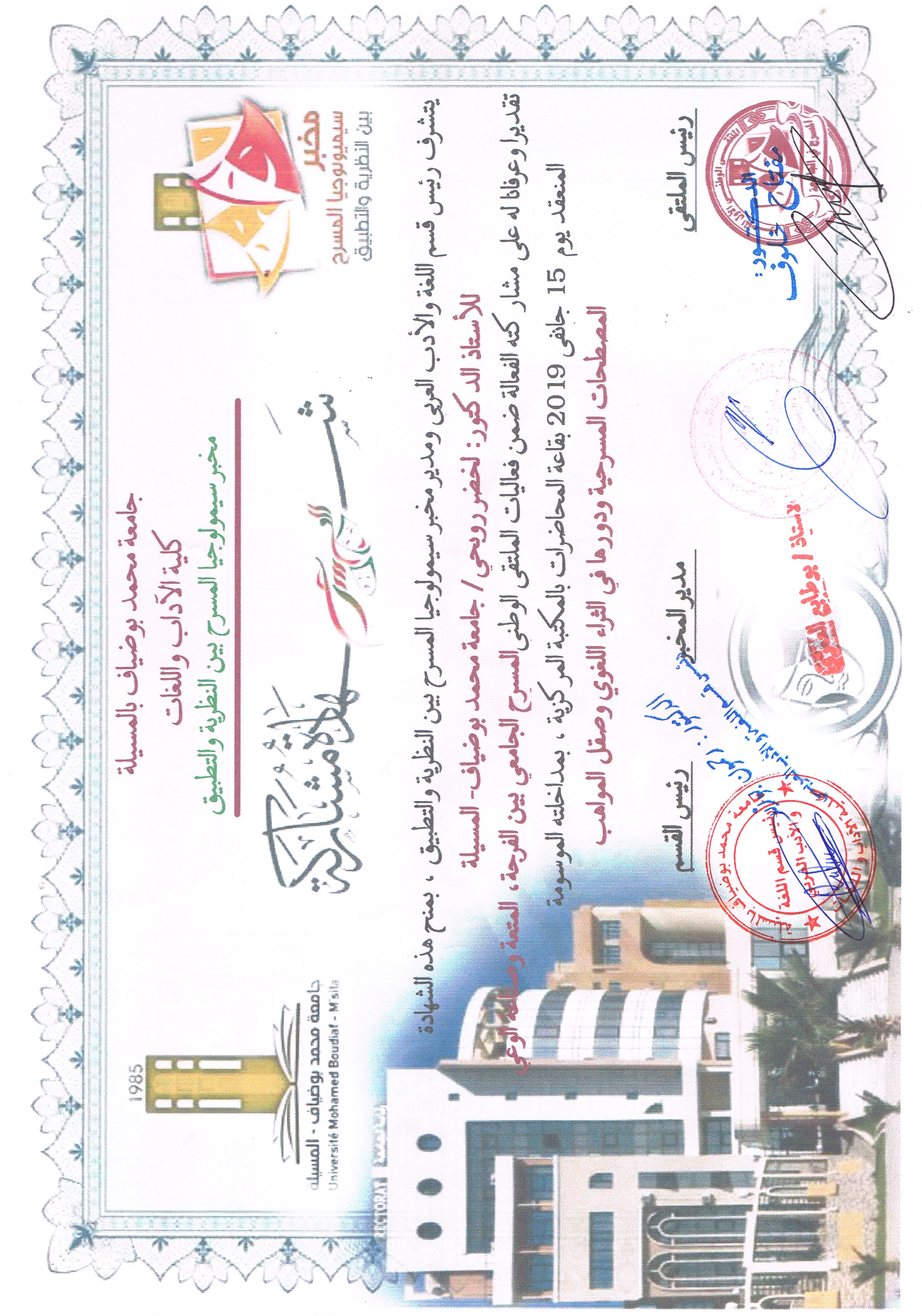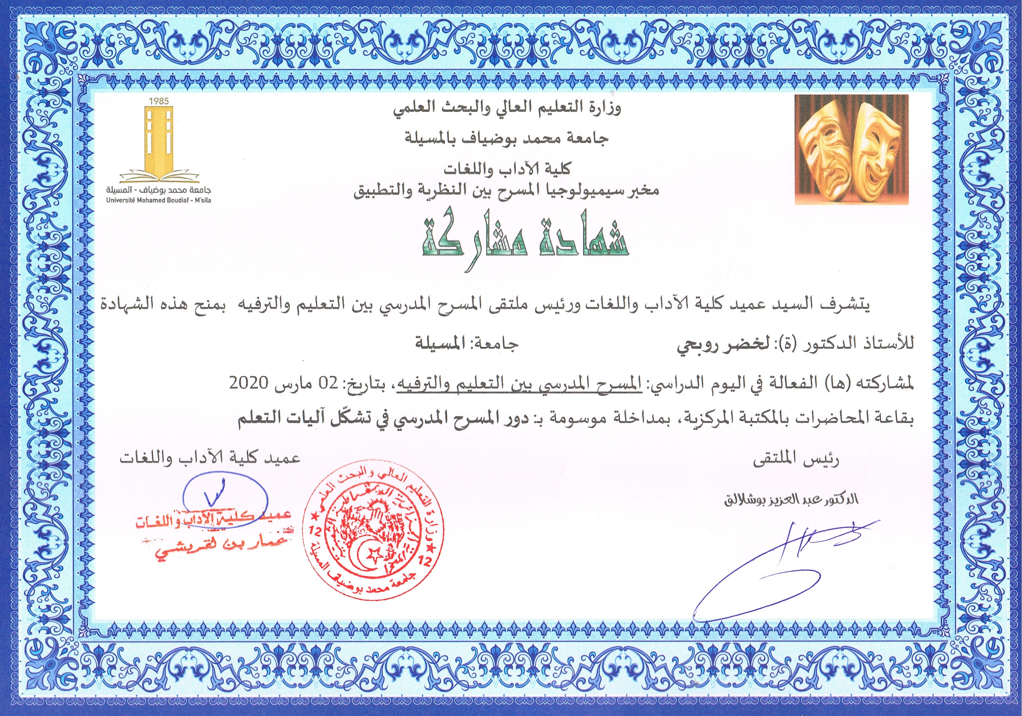 M. ROUBHI Lakhdar, (2019), "المصطلحات المسرحية ودورها في الثراء اللغوي وصقل المواهب", [national] المسرح الجامعي بين الفرجة وصناعة الوعي , جامعة المسيلة