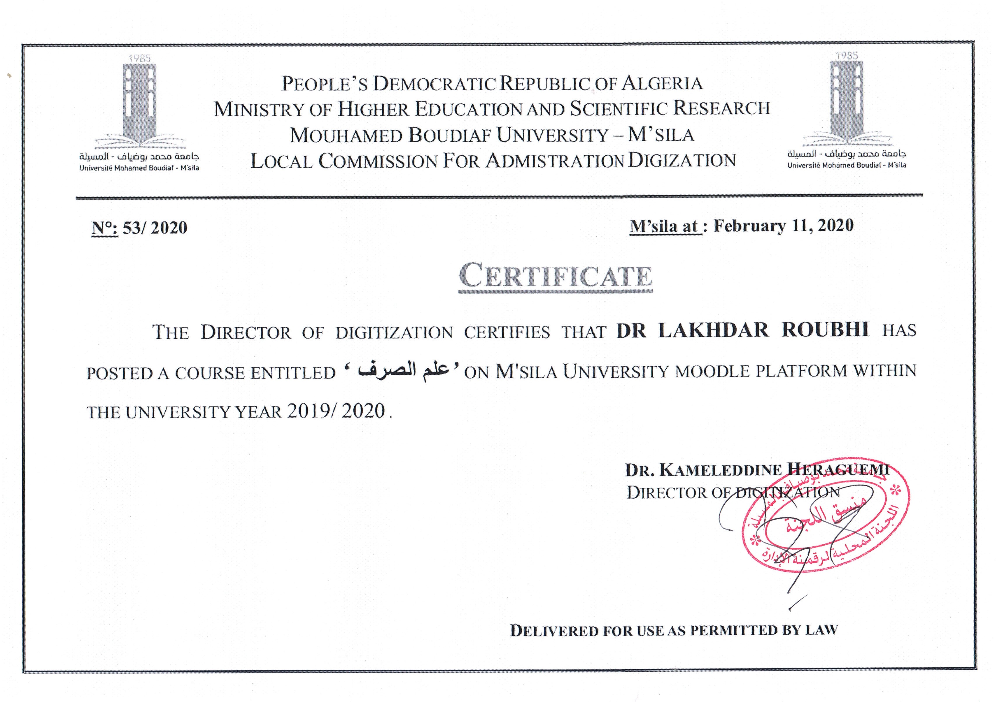 M. ROUBHI Lakhdar, (2020), "علم الصرف", [national] جامعة المسيلة