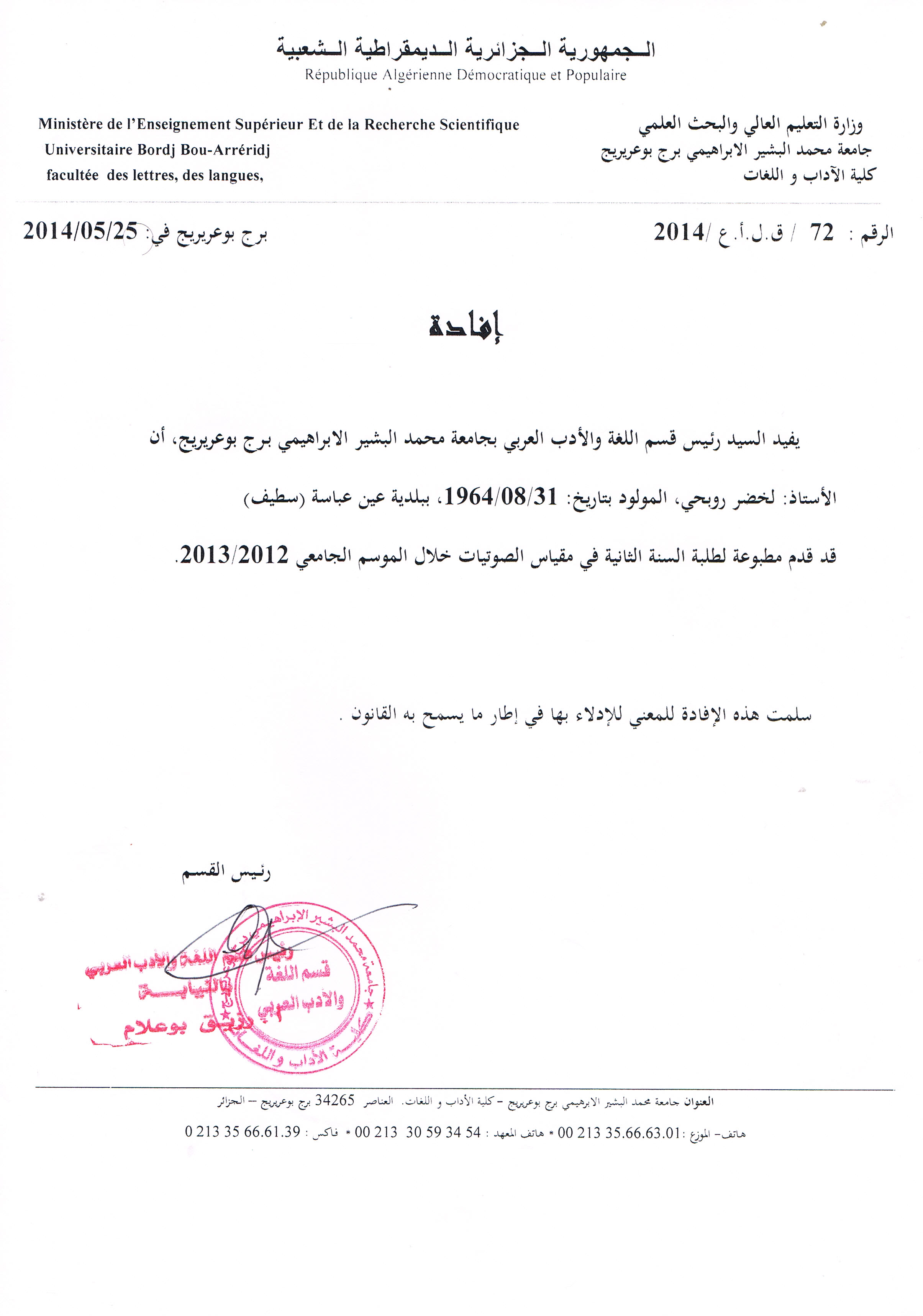 M. ROUBHI Lakhdar, (2014), "مطبوعة في مقياس الصوتيات", [national] جامعة برج بوعرريج