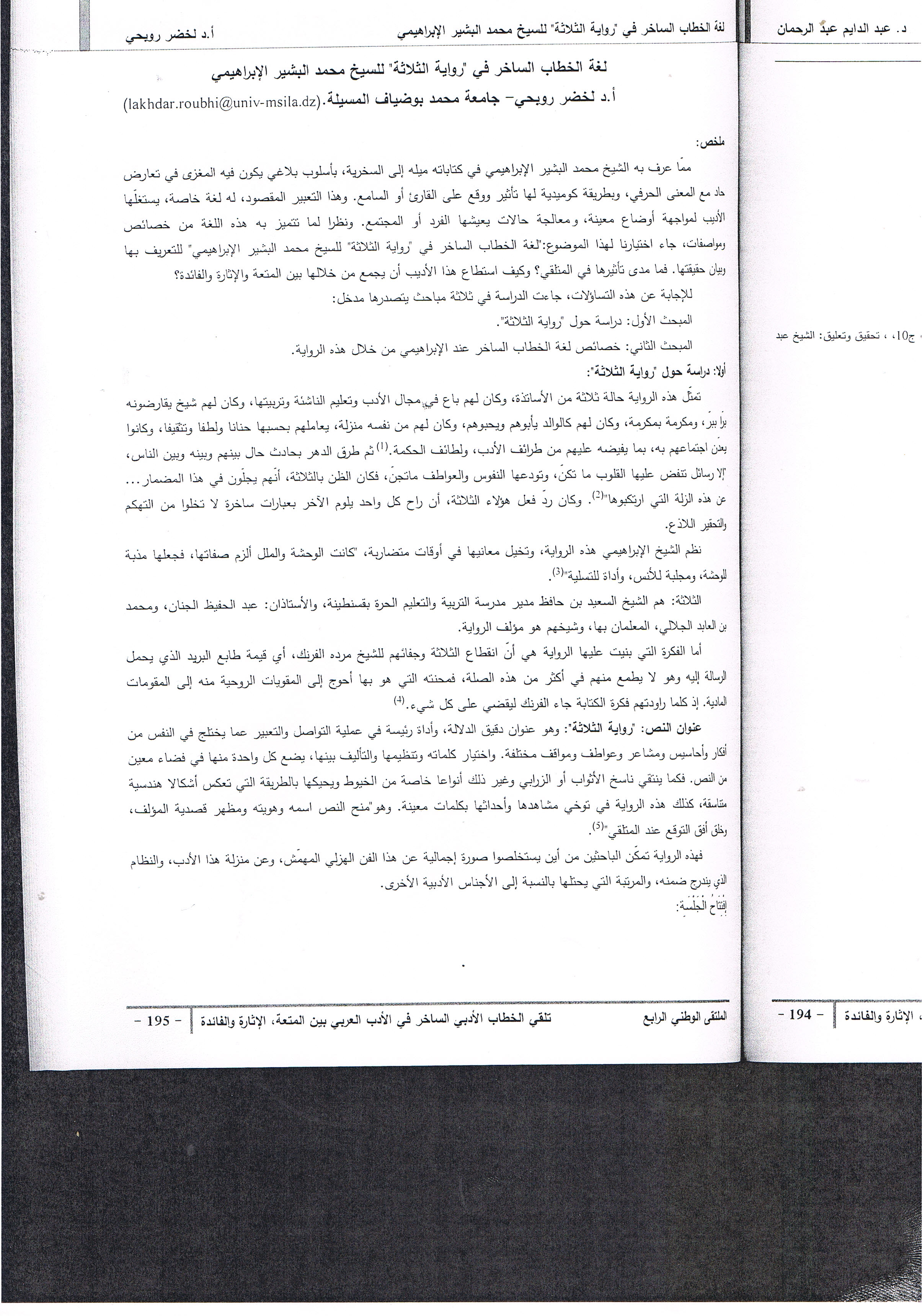 M. ROUBHI Lakhdar, (2020), "لغة الخطاب الساخر في رواية الثلاثة للبشير الإبراهيمي", [national] تلقي الخطاب الأدبي الساخر في الأدب العربي بين المتعة، الإثارة والفائدة , جامعة المسيلة