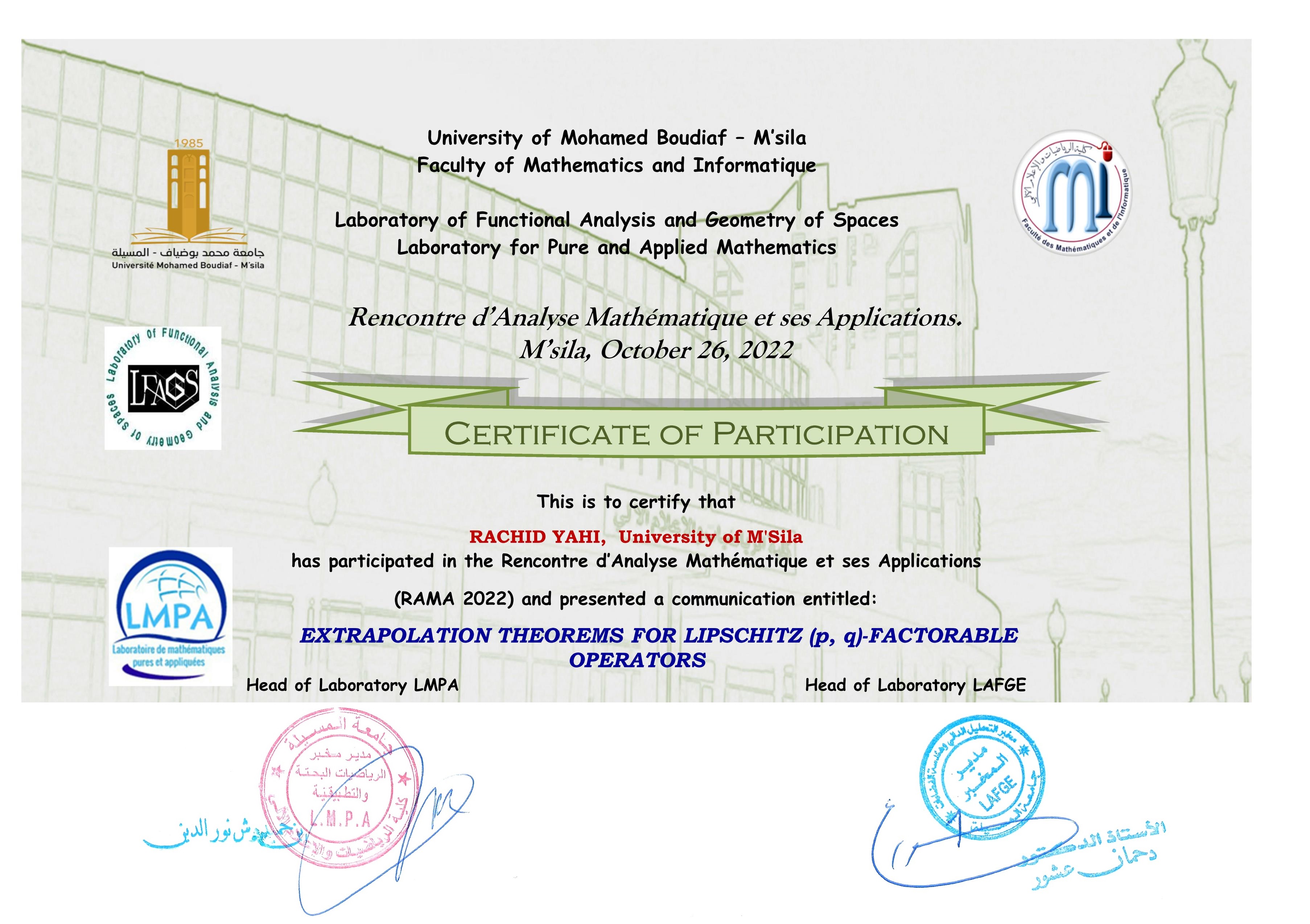 M. YAHI Rachid, (2022), "Extrapolation theorems for Lipschitz (p; q)-factorable operators", [national] Rencontre d’Analyse Mathématique et ses Applications (RAMA) , جامعة محمد بوضياف مسيلة