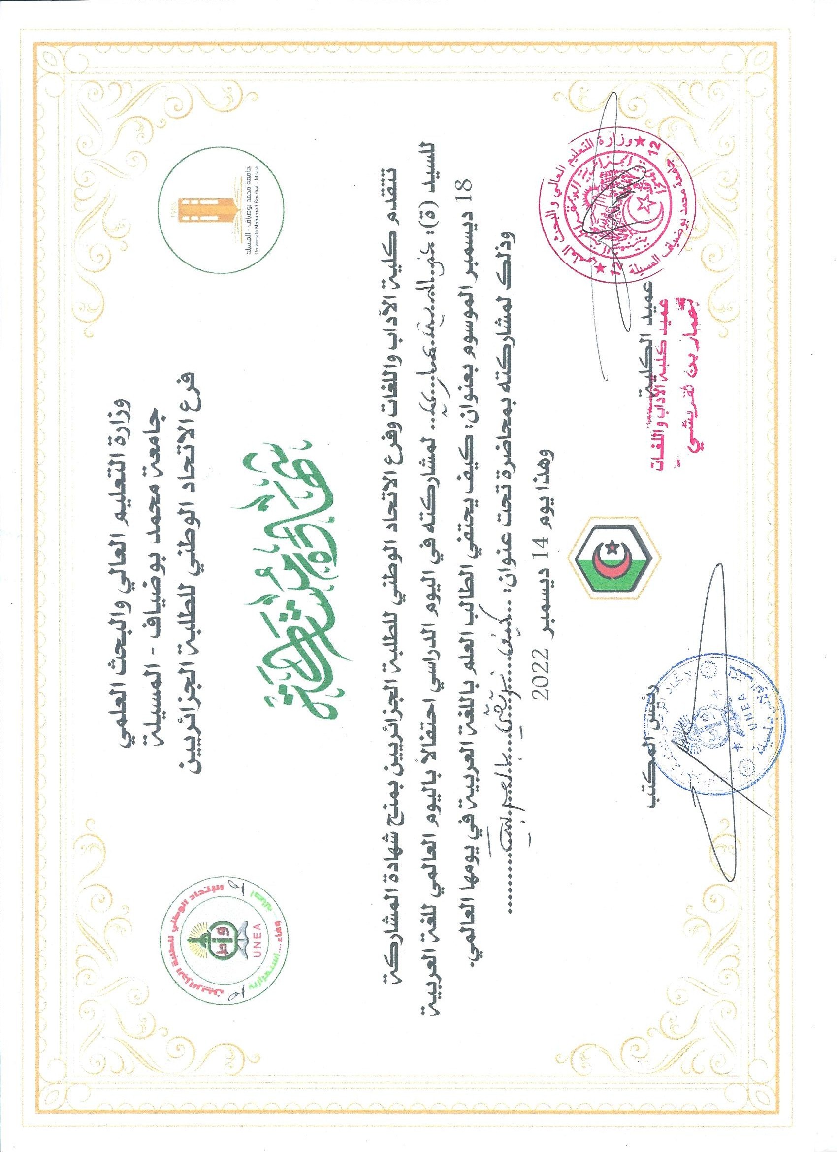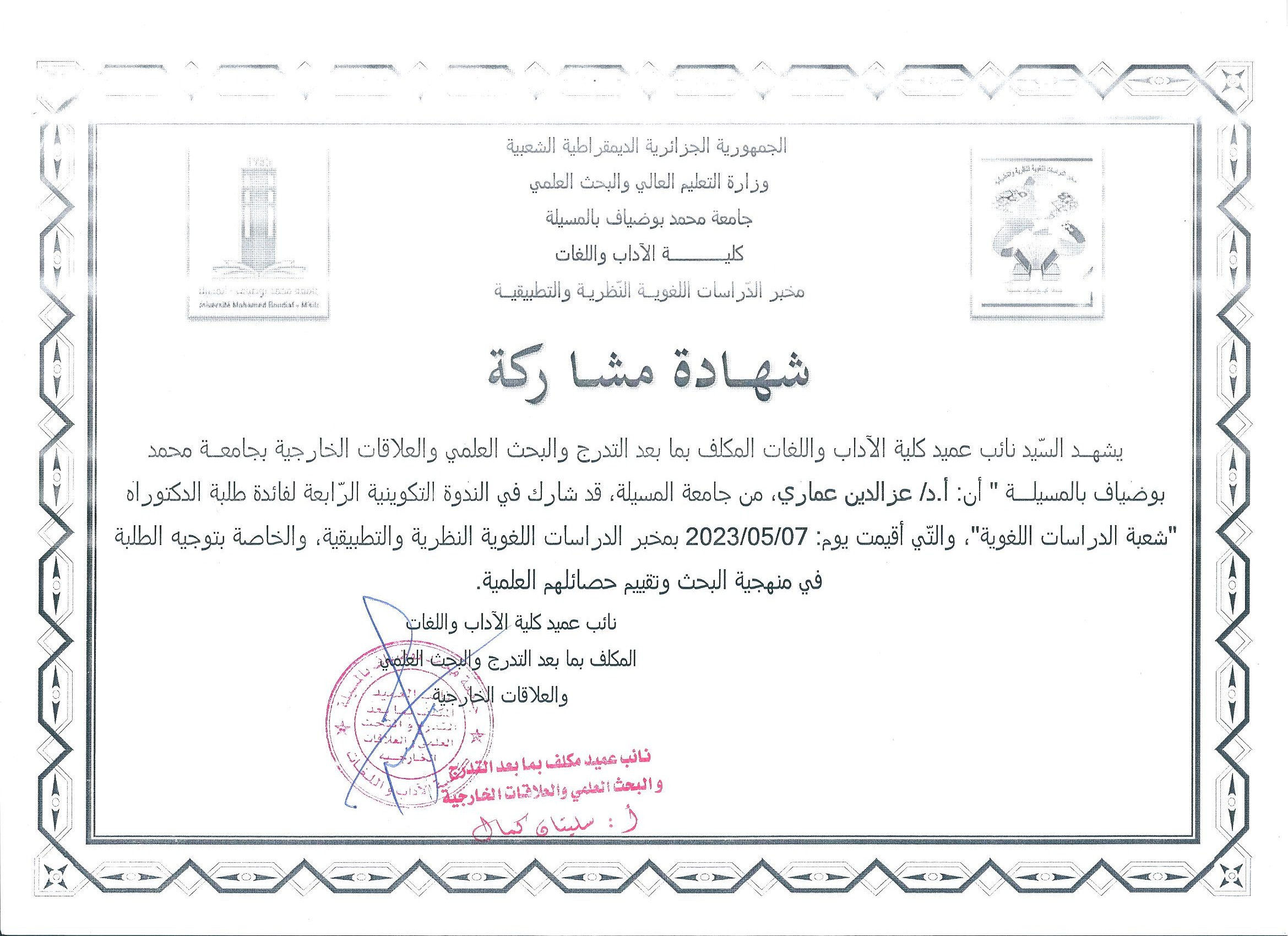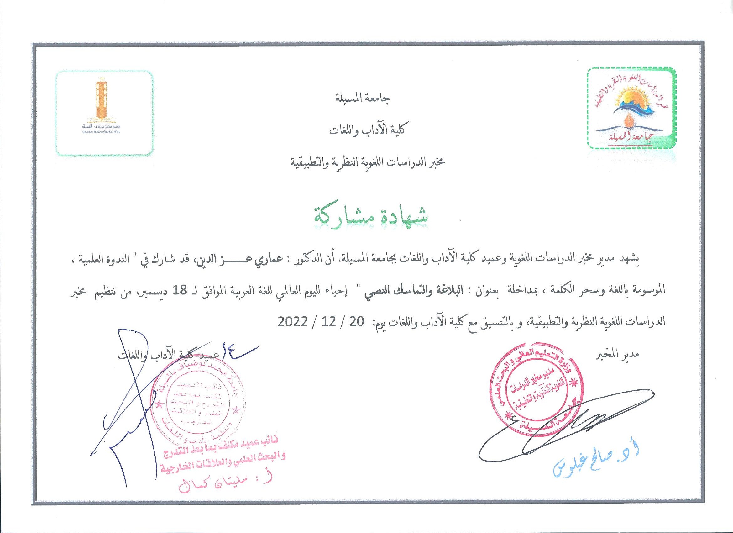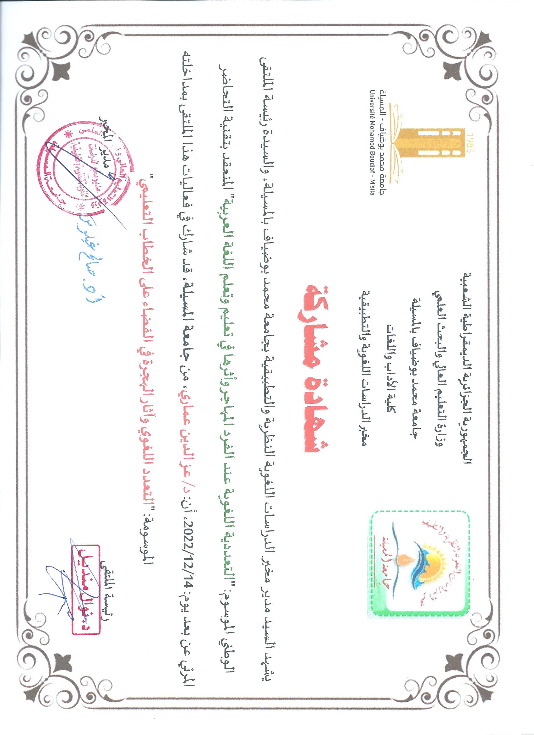 M. AMMARI Azzeddine, (2022), "كيف نرتقي بالعربية", [national] مشاركة احتفاء باللغة العربية . الاتحاد الوطني , جامعة المسيلة