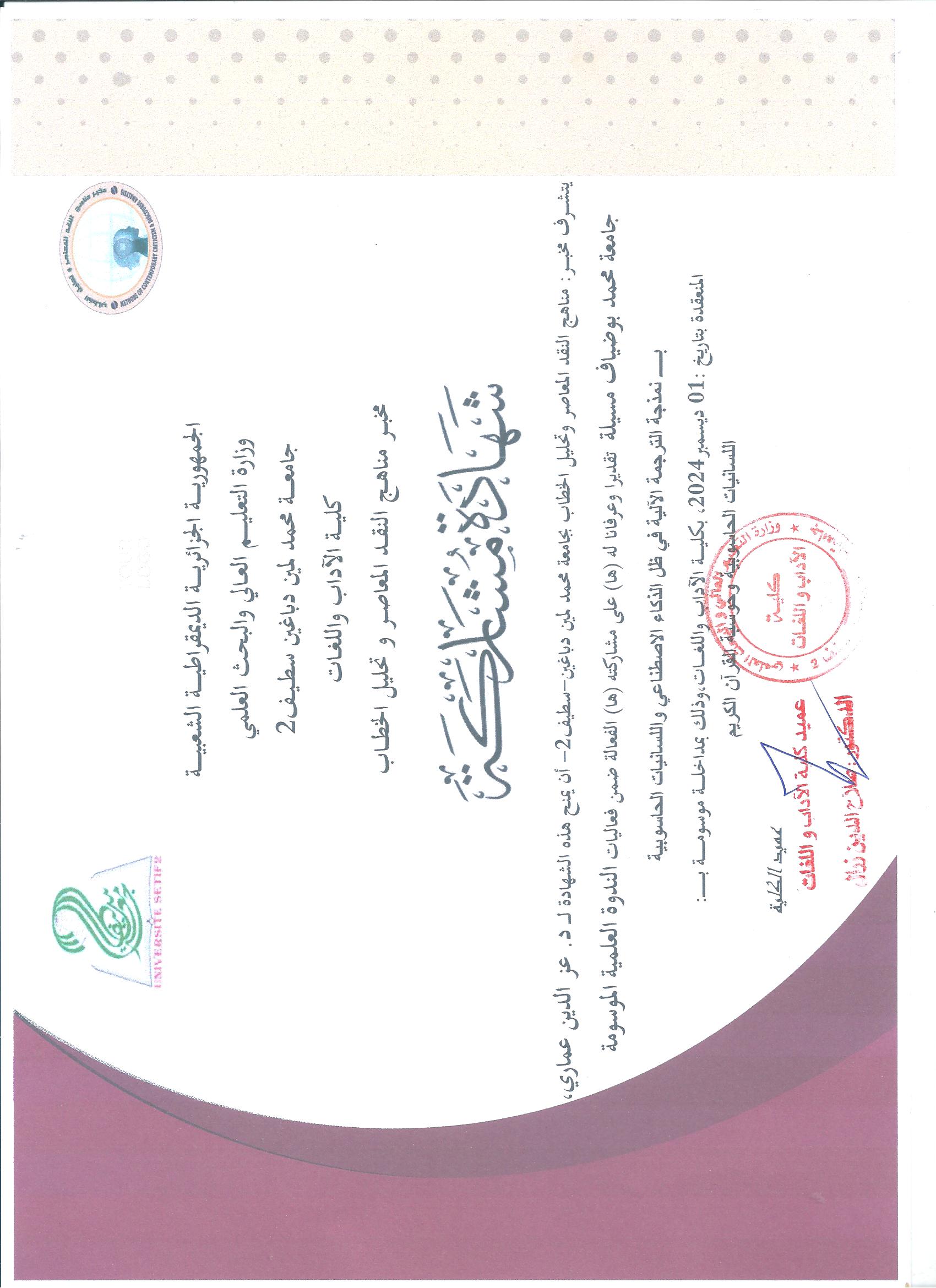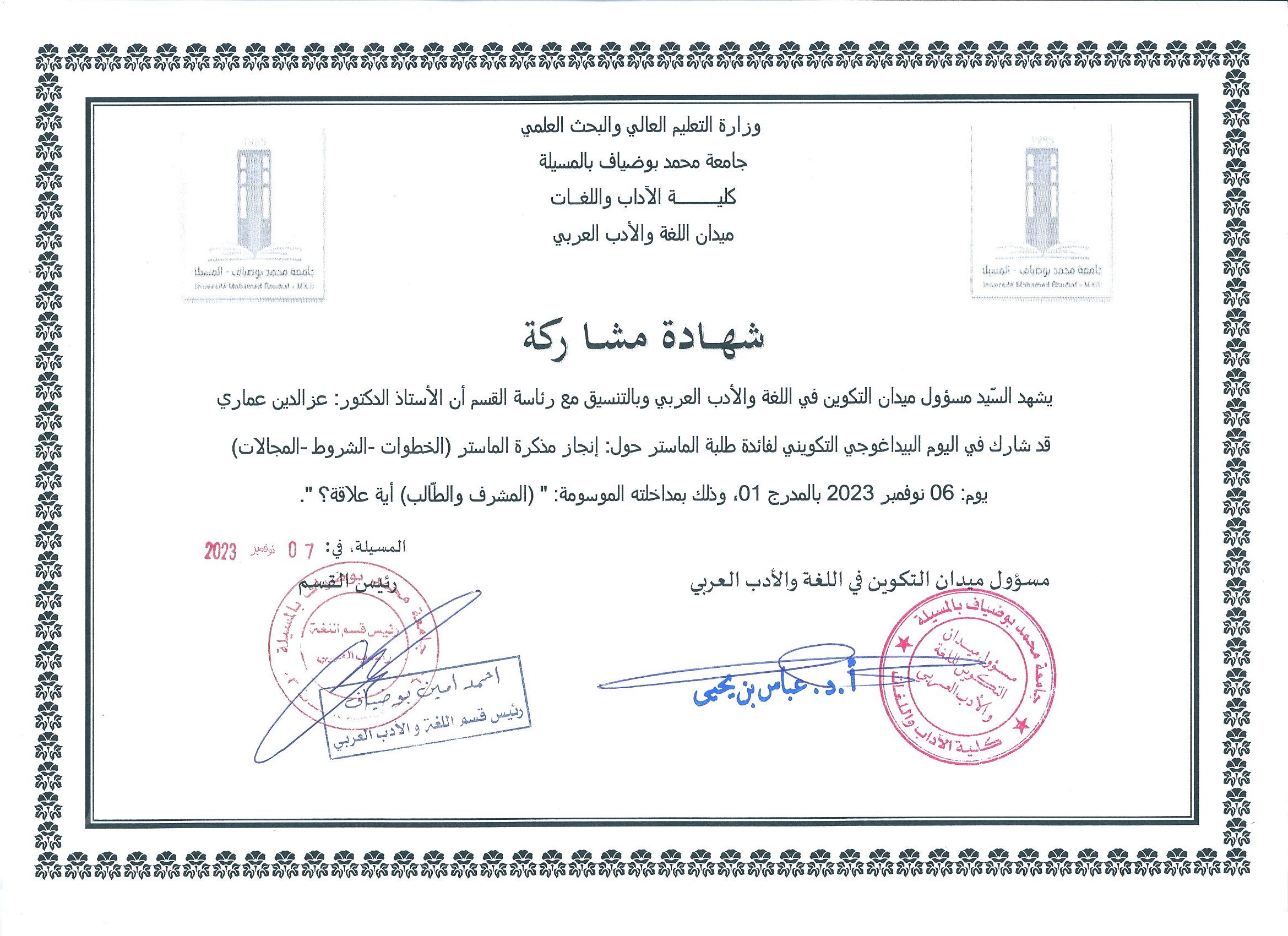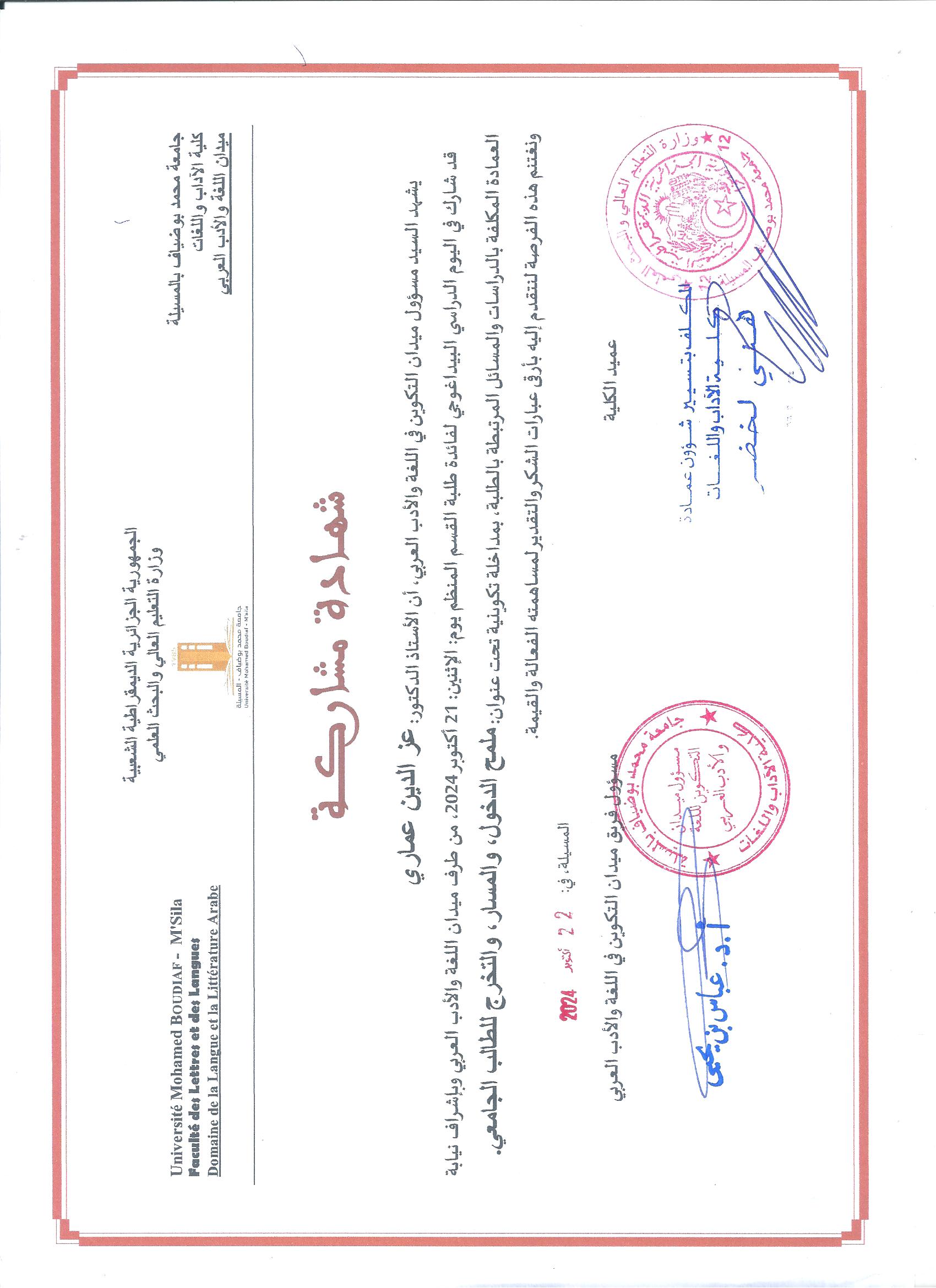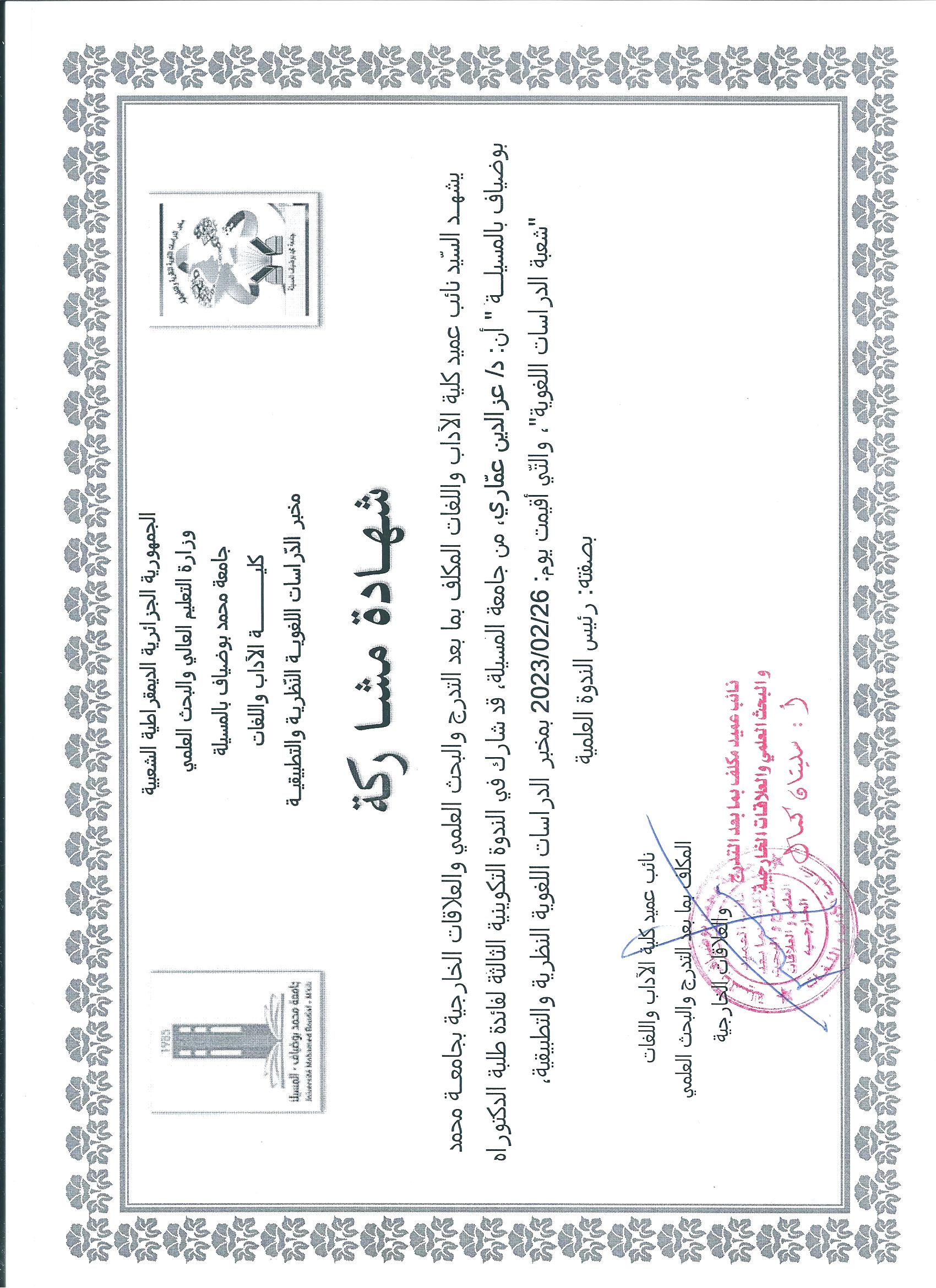 M. AMMARI Azzeddine, (2022), "كيف نرتقي بالعربية", [national] مشاركة احتفاء باللغة العربية . الاتحاد الوطني , جامعة المسيلة