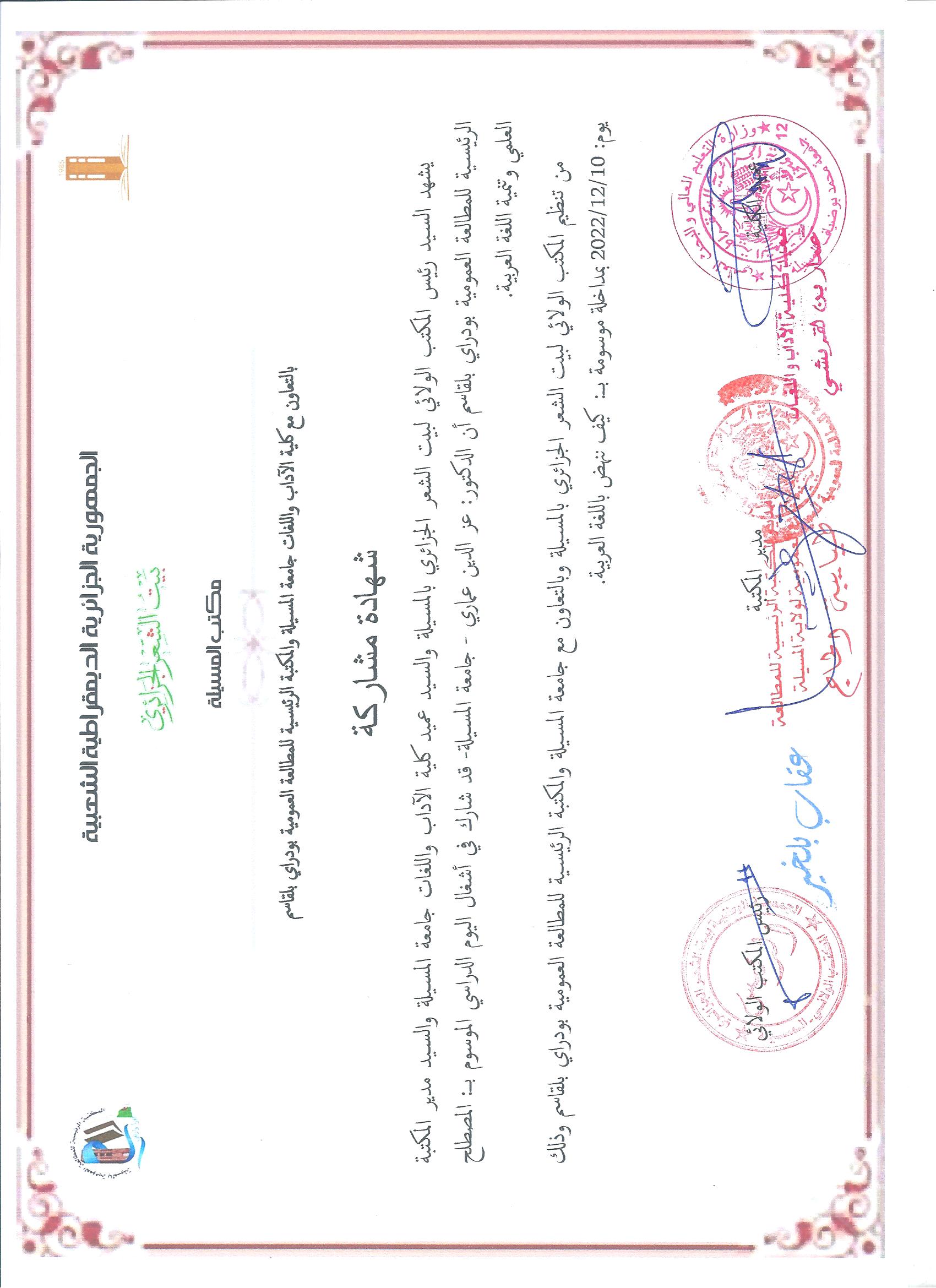 M. AMMARI Azzeddine, (2022), "كيف ننهض باللغة العربية", [national] مشاركة احتفاء باللغة العربية. بيت الشعر , المكتبة العمومية الرئيسية بودراي بلقاسم