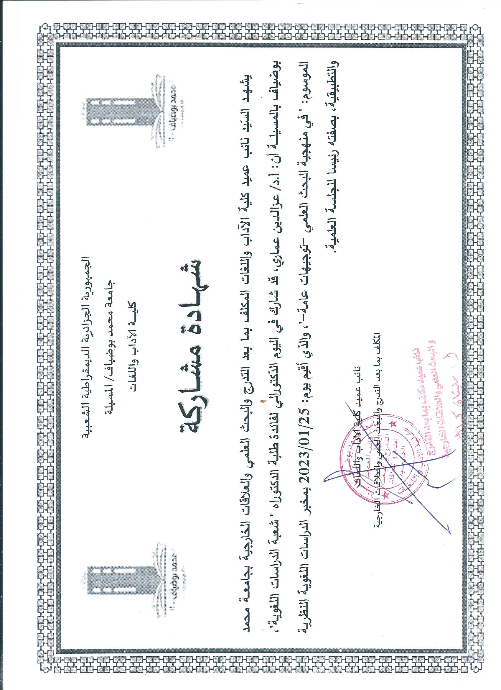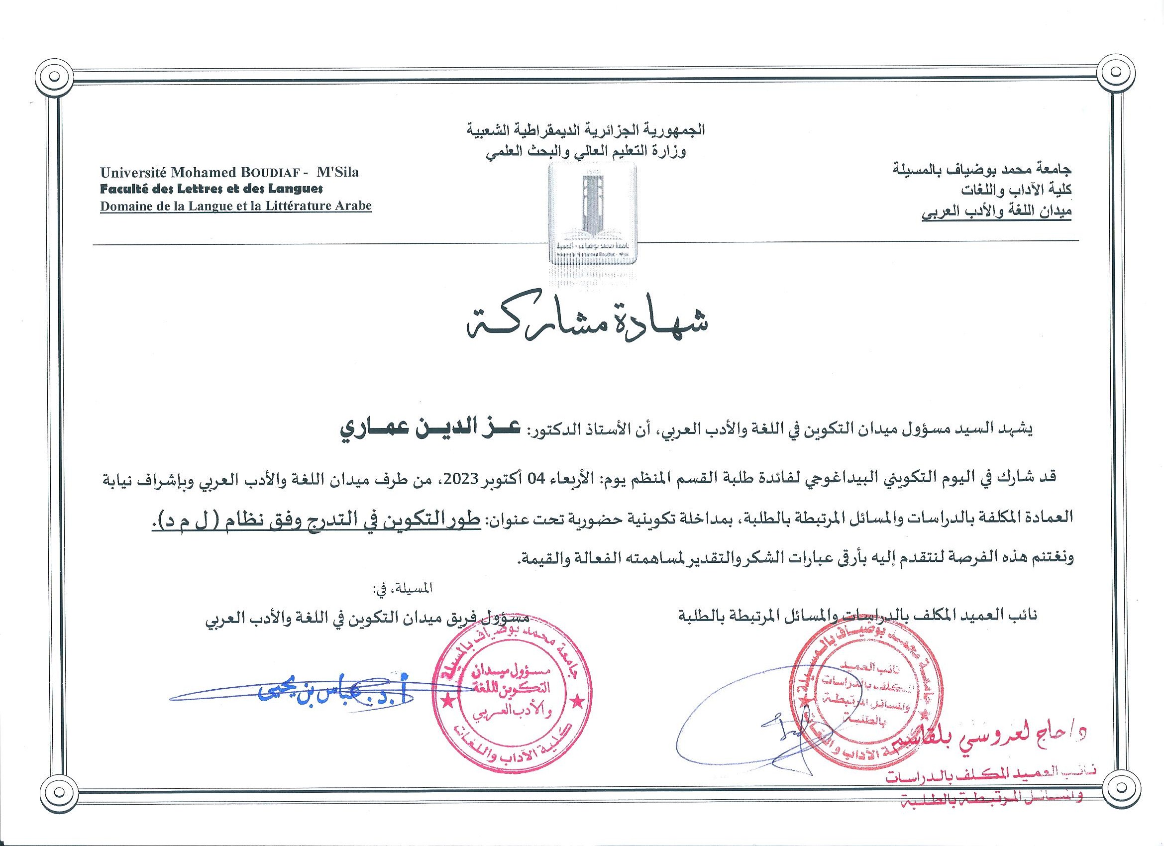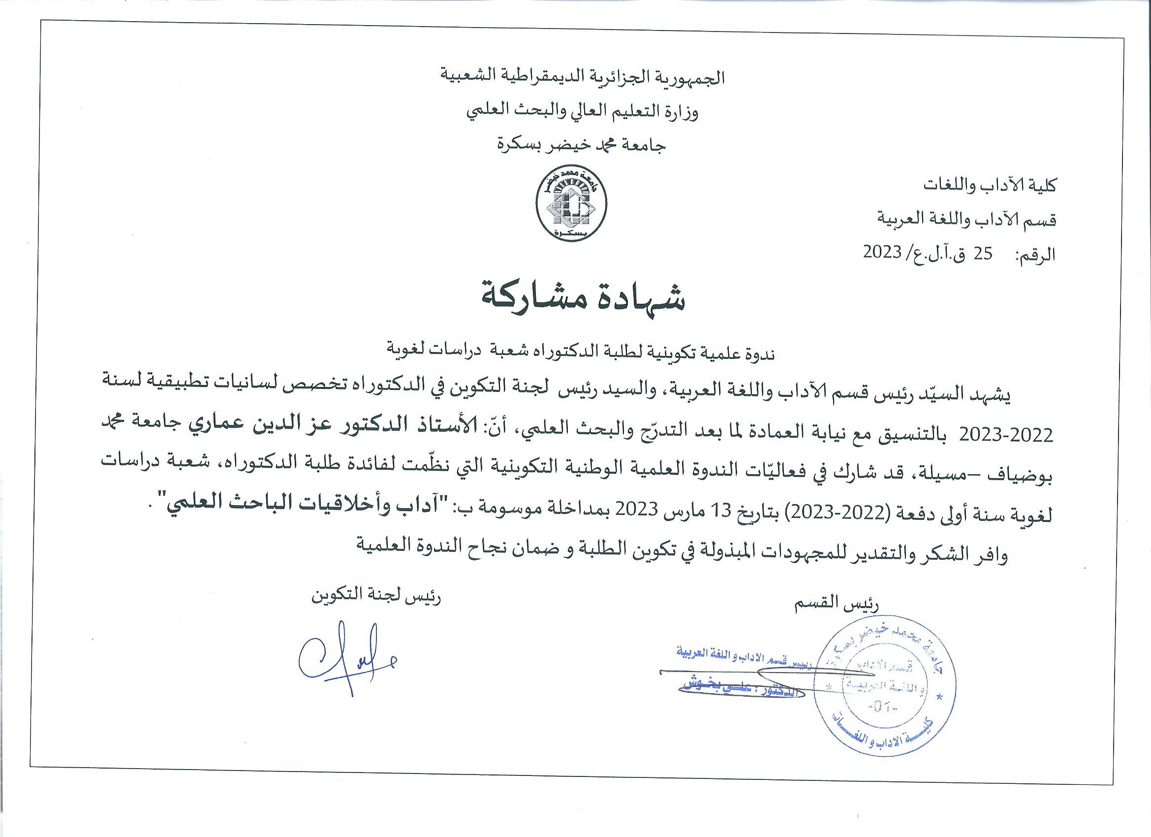 M. AMMARI Azzeddine, (2023), "ندوة تكوينية لطلبة الدكتوراه، شعبة الدراسات اللغوية", [national] جامعة لمسيلة