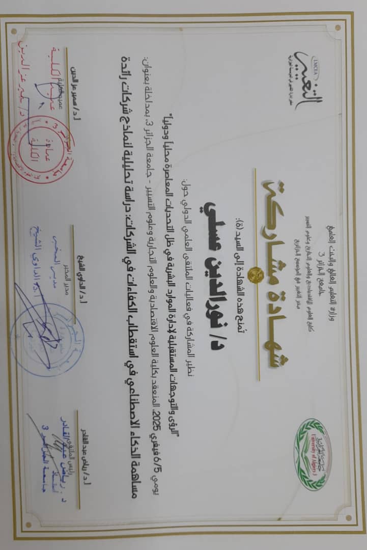 M. ASLI Noureddine, (2025-02-05), "مساهمة الذكاء الاصطناعي في استقطاب الكفاءات في الشركات. دراسة تحليلية لنماذج شركات رائدة", [international] الرؤى والتوجهات المستقبلية لإدارة الموارد البشرية في ظلّ التحدّيات المعاصره محليا ودوليا , جامعة الجزائر 3