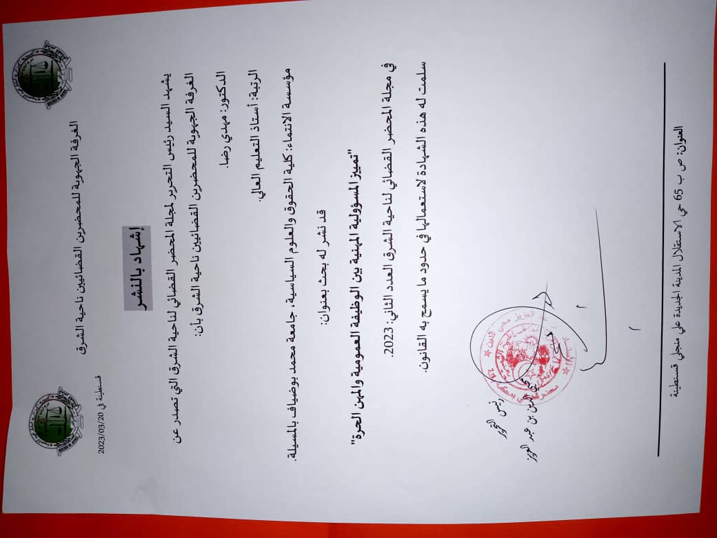 M. MAHDI Ridda, (2023), "تميز المسؤولية المهنية بين الوظيفة العمومية والمهن الحرة", [national] المحضر القضائي , الغرفة الجهوية للمحضرين القضائين ناحية الشرق