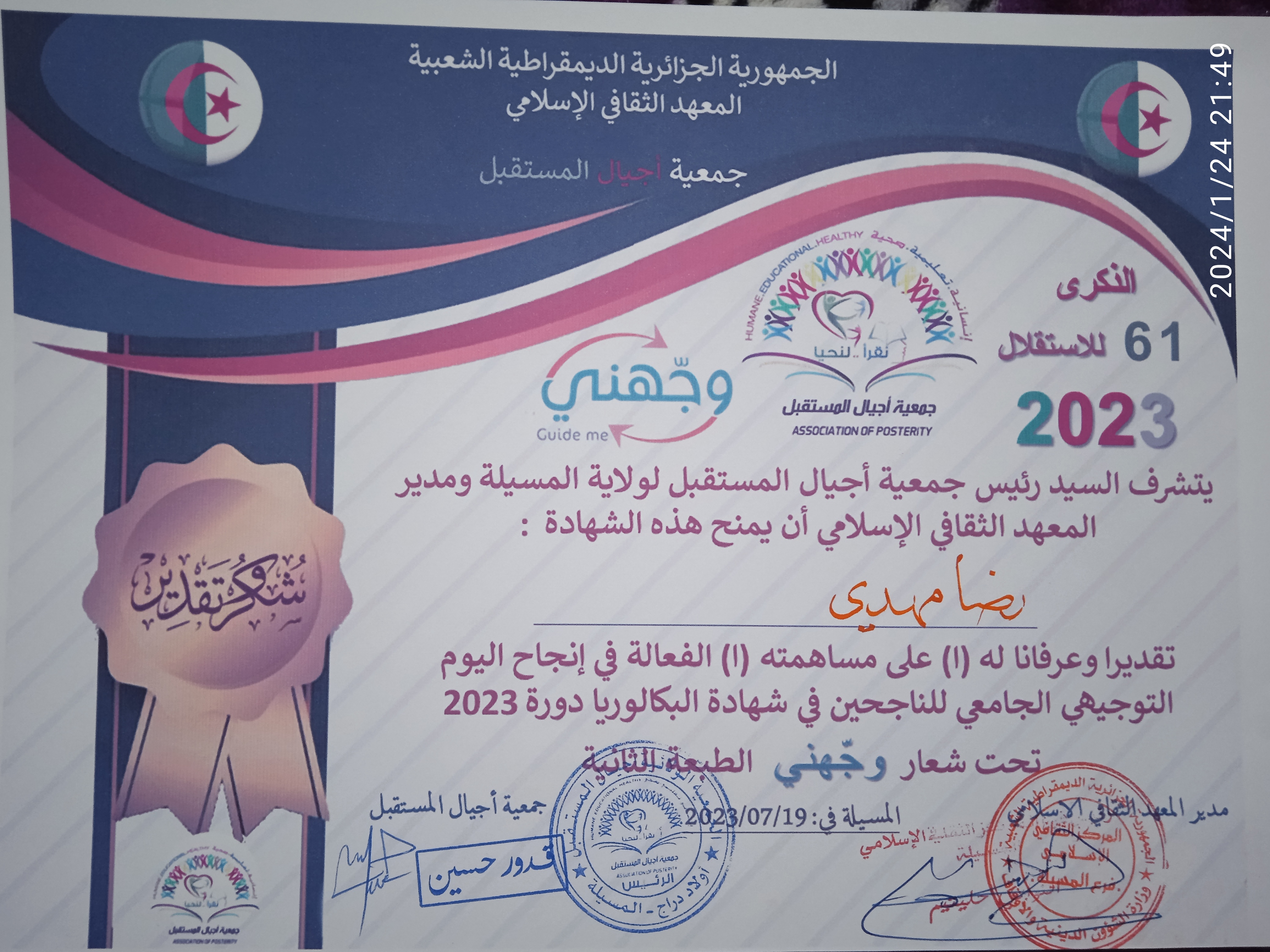 M. MAHDI Ridda, (2024-02-04), "التخصصات الجامعية", [national] وجهني , جمعية اجيال المستقبل - اولاد دراج
