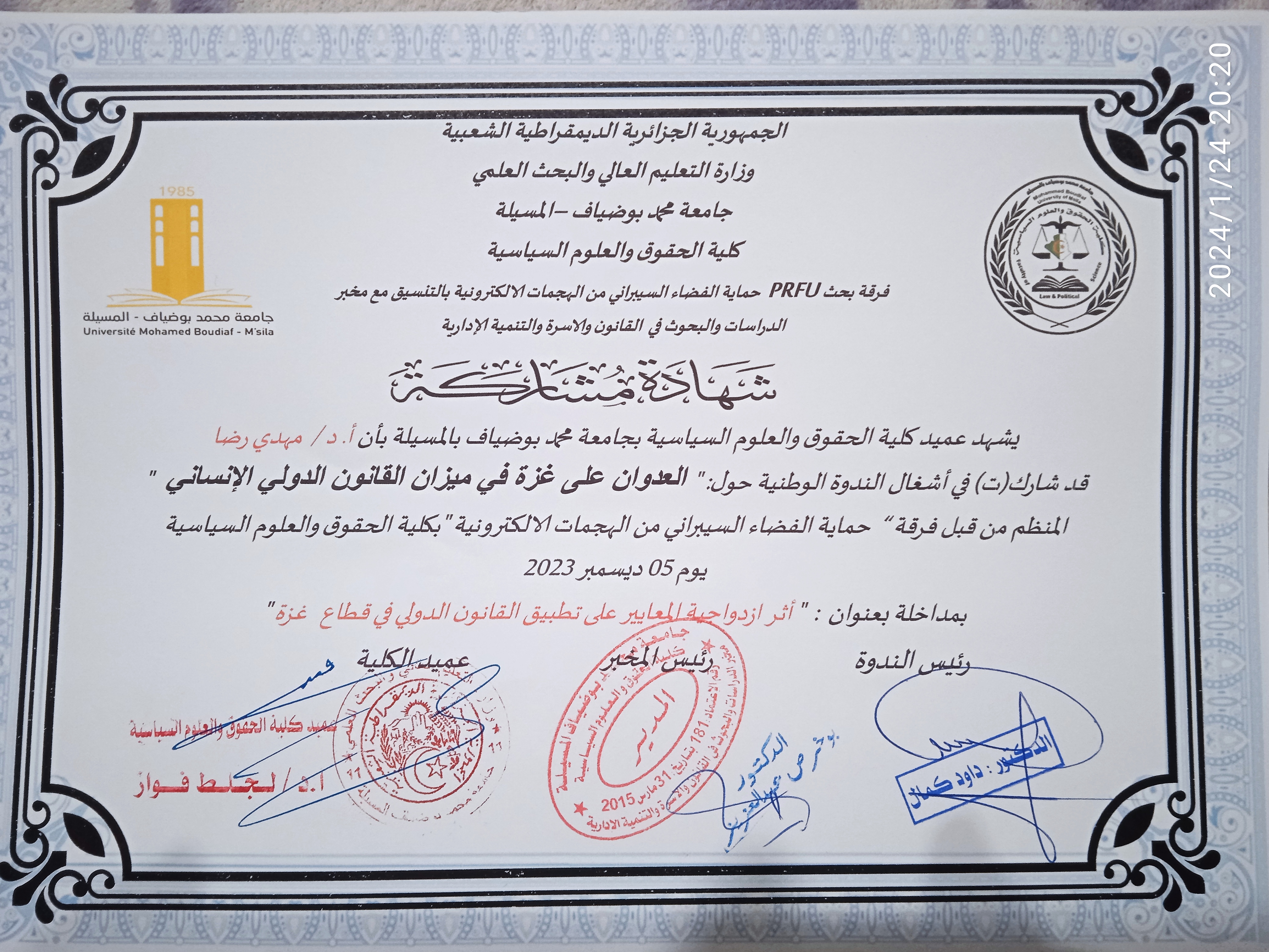 M. MAHDI Ridda, (2022), "الصحافيون والقانون الدولي", [national] ندوة حول الصحافيون والقانون الدولي , جامعة المسيلة