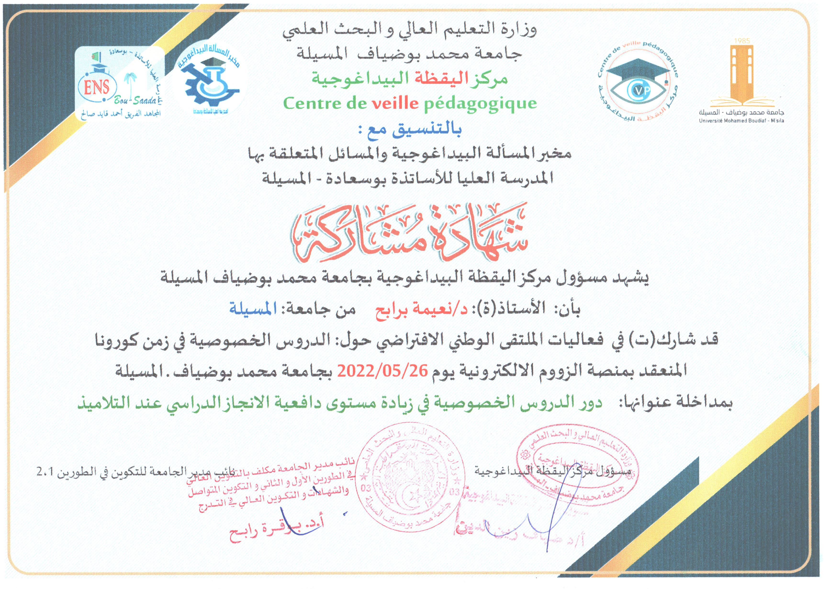 M. BERRABAH Naima, (2022-05-26), "دور الدروس الخصوصية في زيادة مستوى دافعية الانجاز الدراسي عند التلاميذ.", [national] الدروس الخصوصية في زمن كورونا- قراءة تقييمية- , جامعة محمد بوضياف، المسيلة، الجزائر