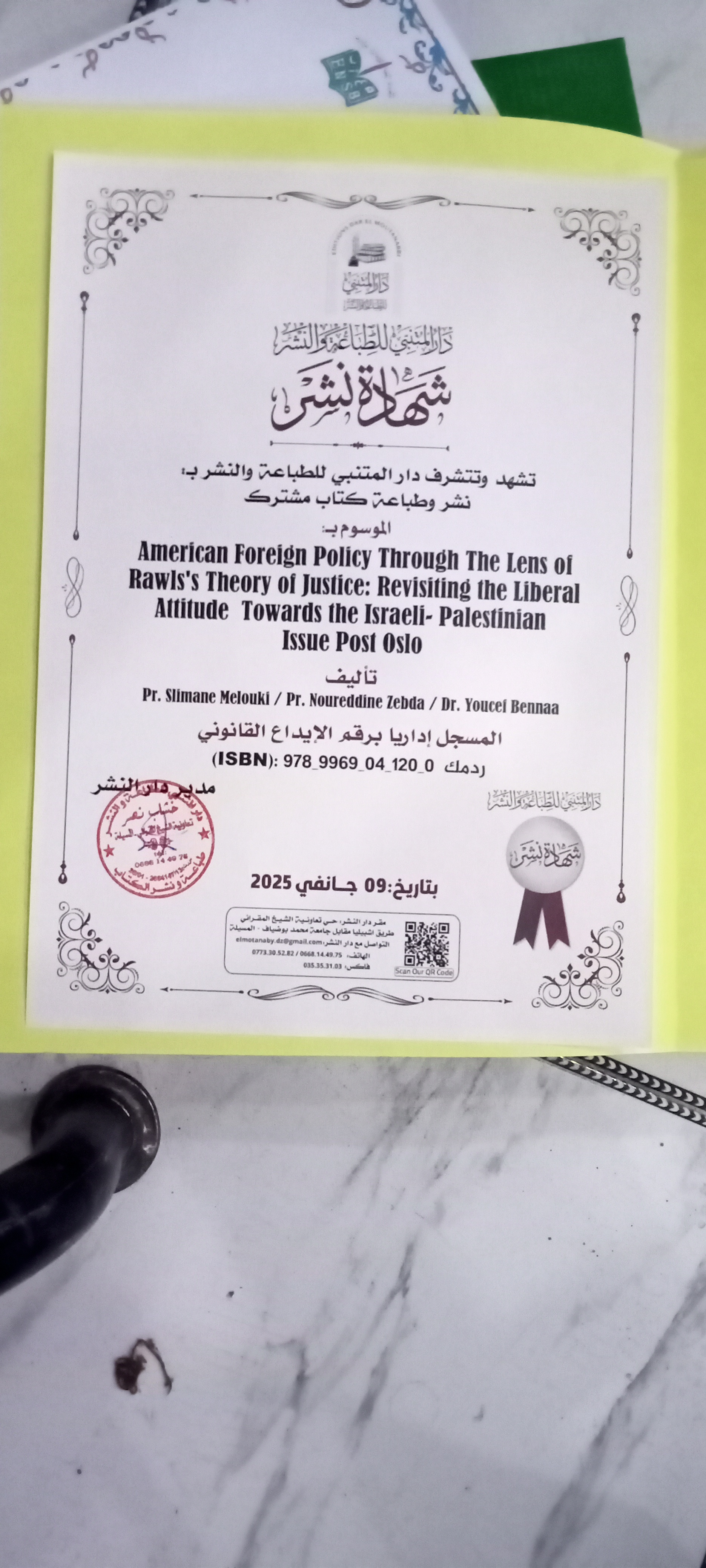 M. BENNAA Youcef, (2025-01-09), "American Foreign Policy through the Lens of Rawl'sTheory of Justice: Revisiting the Liberal Attitude towards the Israeli-Palestinian Issue Post Oslo", [national] , -دار المتنبي للطباعة والنشر-المسيلة