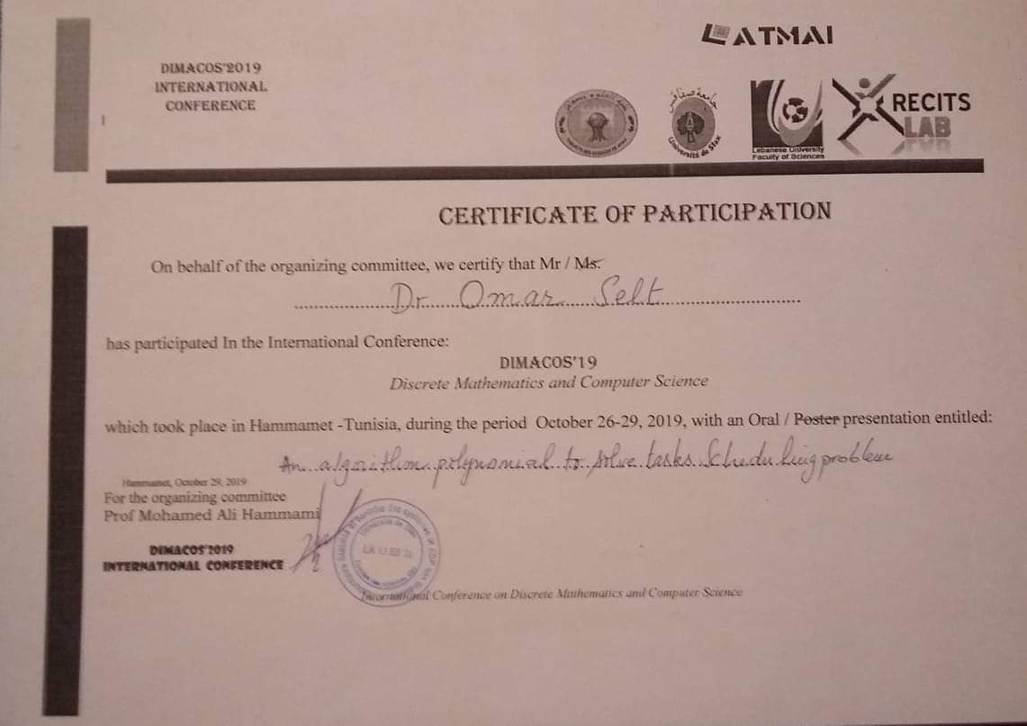 M. SELT Omar, (2019), "An algorithm polynomial to solve tasks Schudeling problem", [international] DIMACOS 19 , Hammamet, Tunisie