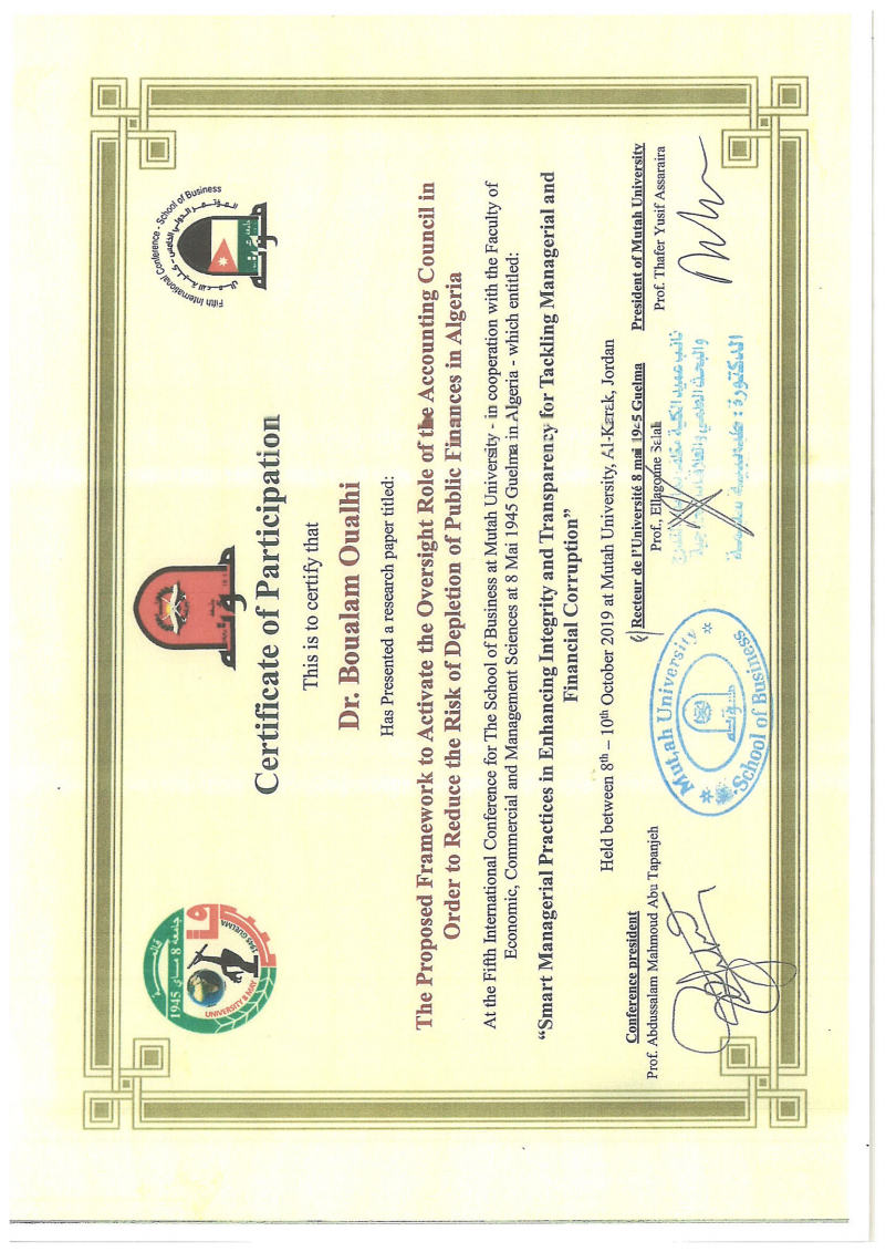 M. OUALHI Boualam, (2019), "نحو اطار مقترح لتفعيل الدور الرقابي لمجلس المحاسبة لتقليص مخاطر استنزاف المال العام - حالة الجزائر", [international] المؤتمر الدولي الخامس كلية الاعمال مؤتة الاردن , كلية الأعمال – جامعة مؤتة الأردن