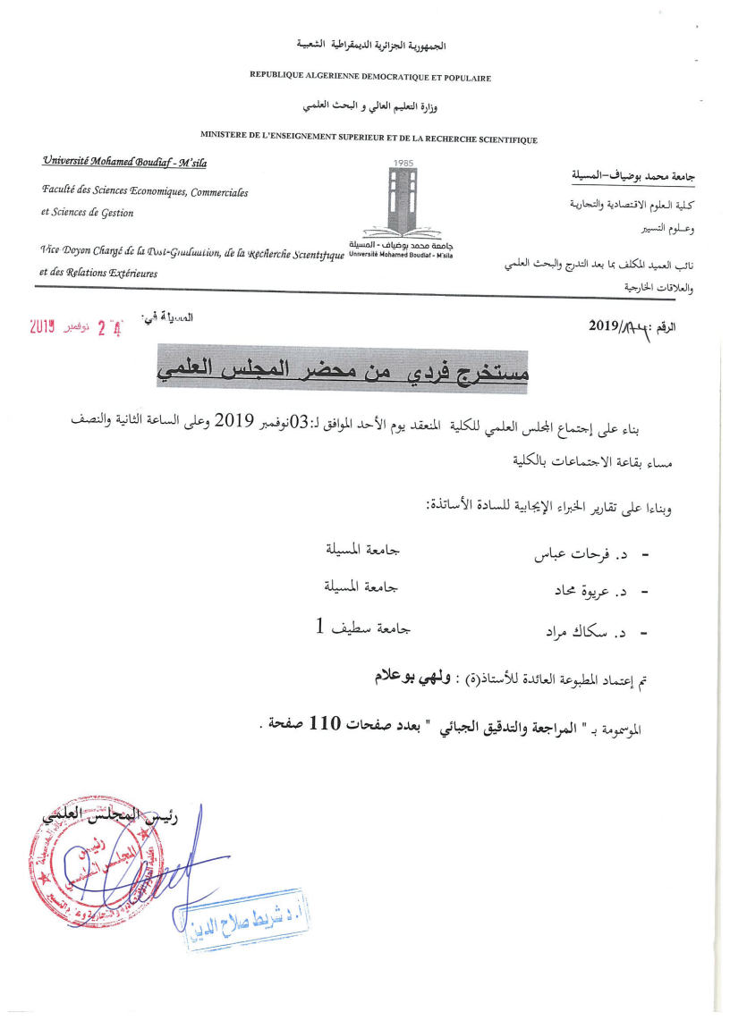 M. OUALHI Boualam, (2019), "المراجعة والتدقيق الجبائي", [national] كلية العلوم الاقتصادية وعلوم التسيير - جامعة المسيلة