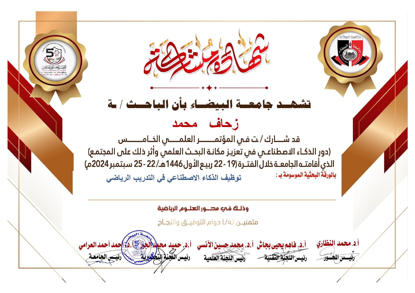 M. ZAHAF Mohamed, (2024-09-22), "توظيف الدكاء الاصطناعي في التدريب الرياضي", [international] المؤتمر الدولي الخامس (دور الدكاء الاصطناعي في تعزيز مكانة البحث العلمي و اثر دلك علي المجتمع) , جامعة البيضاء -اليمن