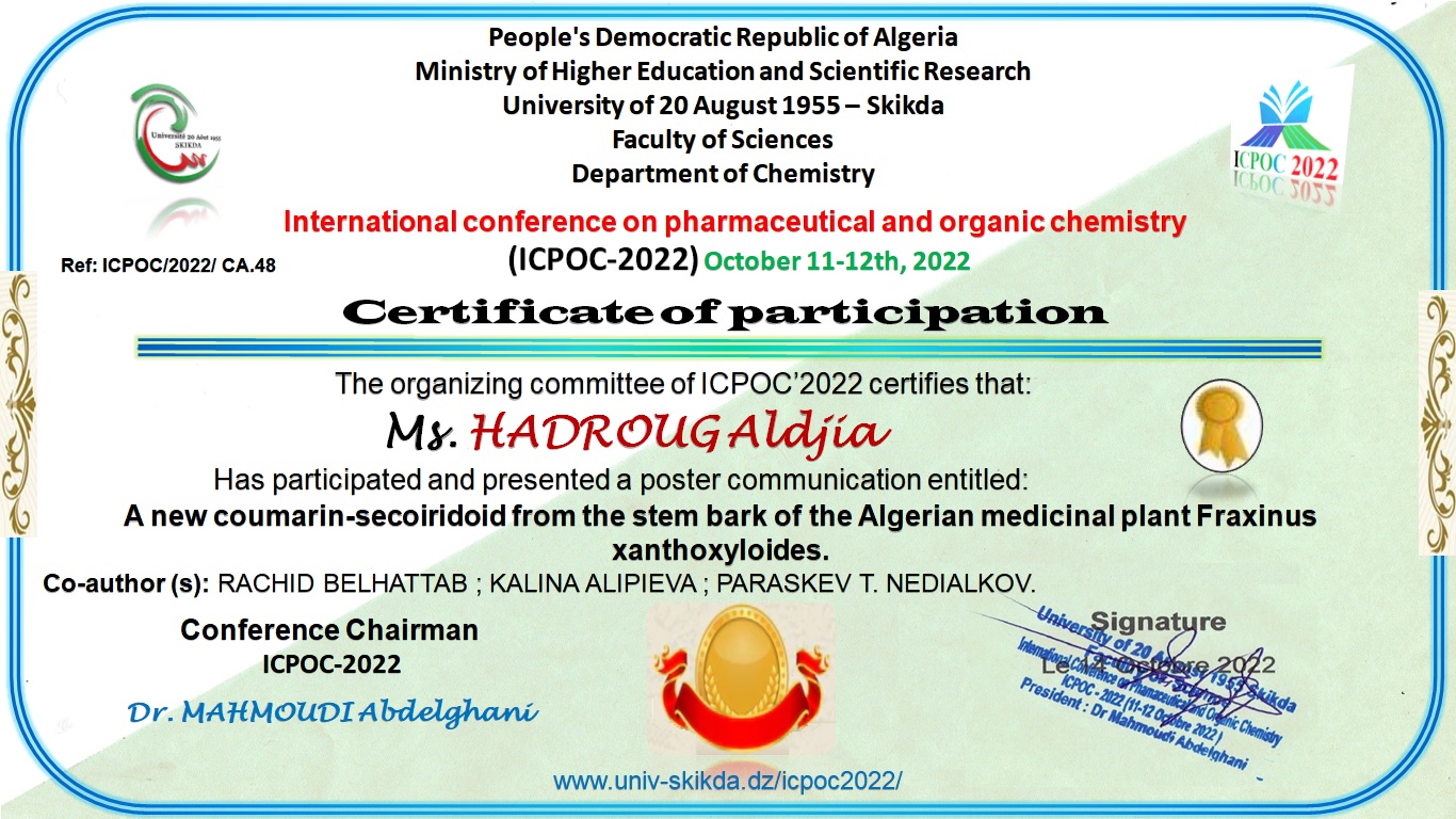 M. HADROUG Aldjia, (2022), "A New coumarin-secoiridoid from the stem bark of the Algerian medicinal plant Fraxinus xanthoxyloides", [international] International conference on pharmaceutical and organic chemistry-Skikda, October 11 - 12 th, 2022 , Skikda