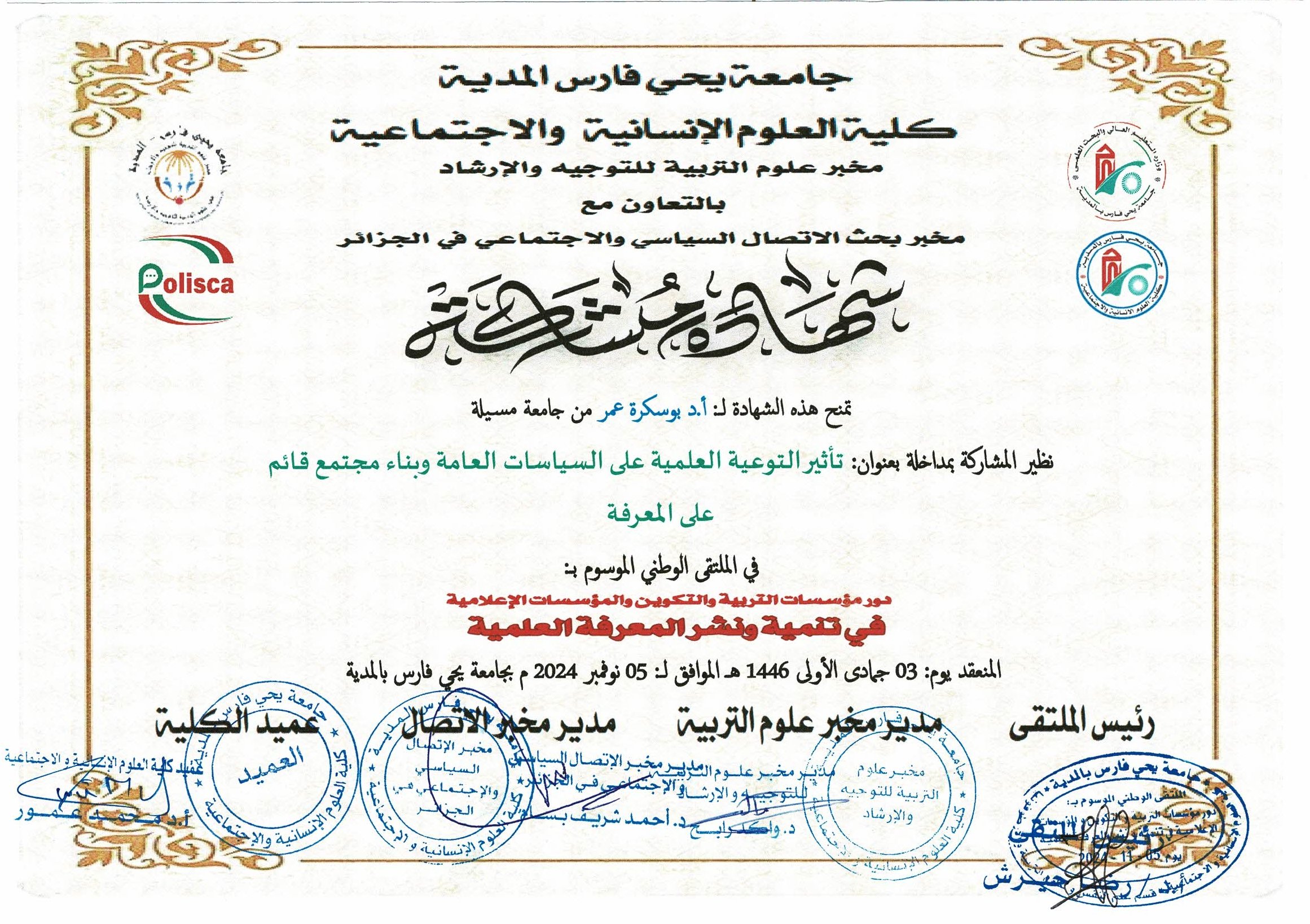 M. BOUSSAKRA Amar, (2024-11-05), "تأثير التوعية العلمية على السياسات العامة وبناء مجتمع قائم على المعرفة", [national] الملتقى الوطني حول: دور مؤسسات التربية والتكوين والمؤسسات الإعلامية في تنمية ونشر المعرفة العلمية , جامعة يحي فارس-المدية