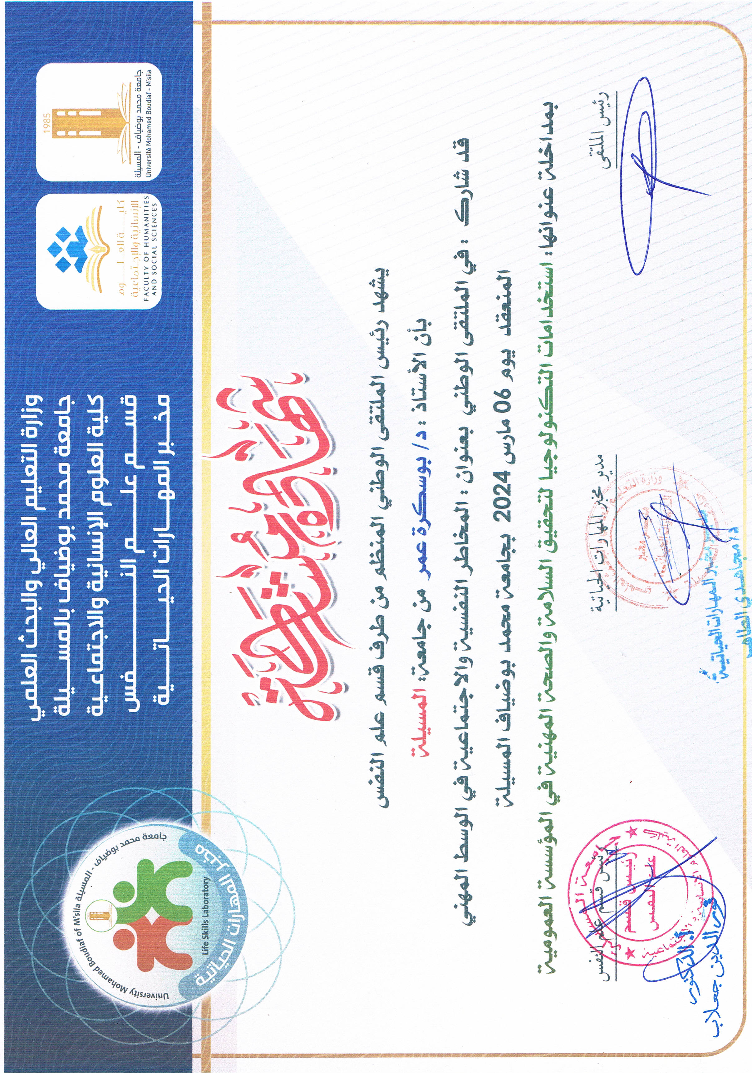 M. BOUSSAKRA Amar, (2024-03-06), "استخدامات التكنولوجيا لتحقيق السلامة والصحة في المؤسسة العمومية", [national] الملتقى الوطني حول: المخاطر النفسية والاجتماعية في الوسط المهني , جامعة محمد بوضياف بالمسيلة