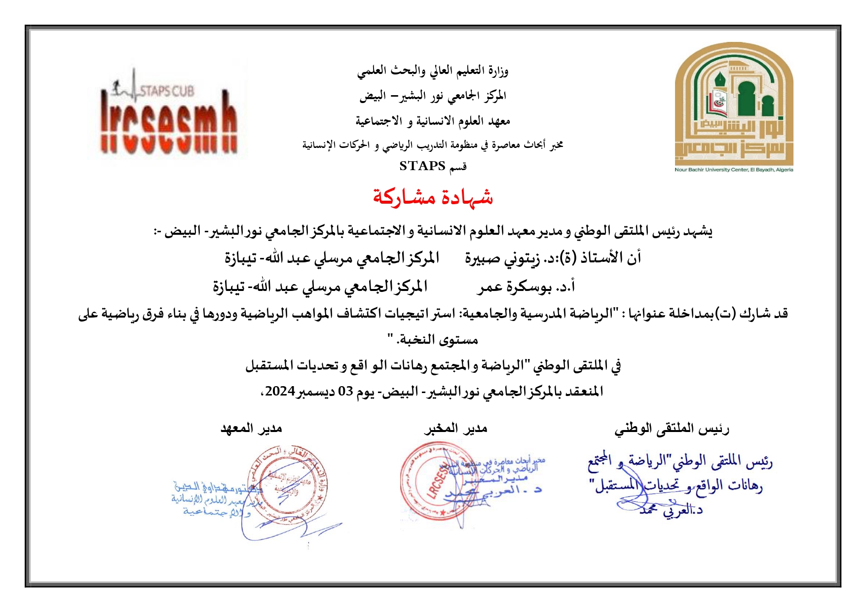 M. BOUSSAKRA Amar, (2024-12-07), "الإدارة البيداغوجية للاستشفاء الرياضي-استراتيجية لتحسين التعافي البدني والنفسي للرياضيين", [national] الملتقى الوطني الأول حول: استخدامات الوسائل التكنولوجية الحديثة في التحضير البدني الحديث , جامعة محمد الشريف مساعدية سوق أهراس