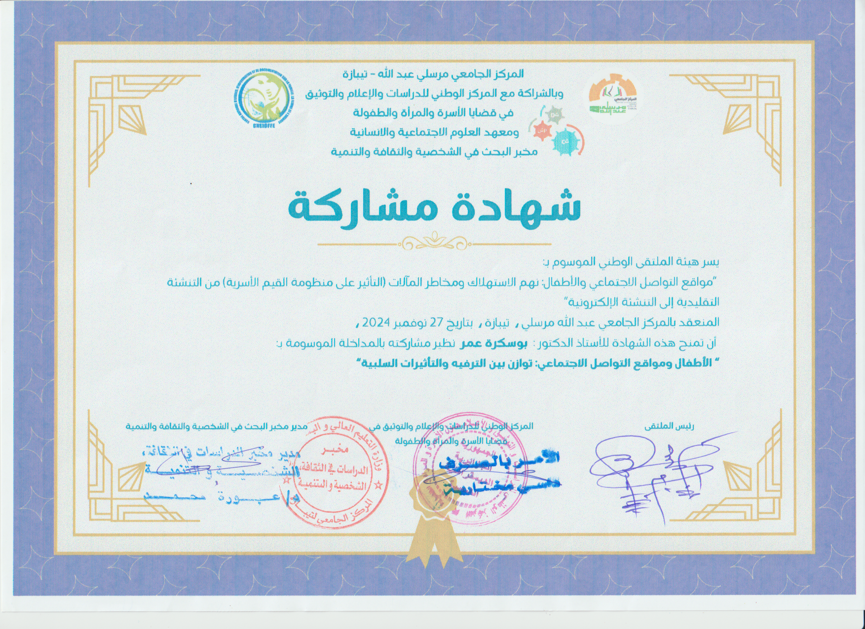 M. BOUSSAKRA Amar, (2024-11-27), "الأطفال ومواقع التواصل الاجتماعي: توازن بين الترفيه والتأثيرات السلبية", [national] الملتقى الوطني الأول حول: مواقع التواصل الاجتماعي والأطفال- نهم الاستهلاك ومخاطر المآلات , المركز الجامعي مرسلي عبد الله- تيبازة
