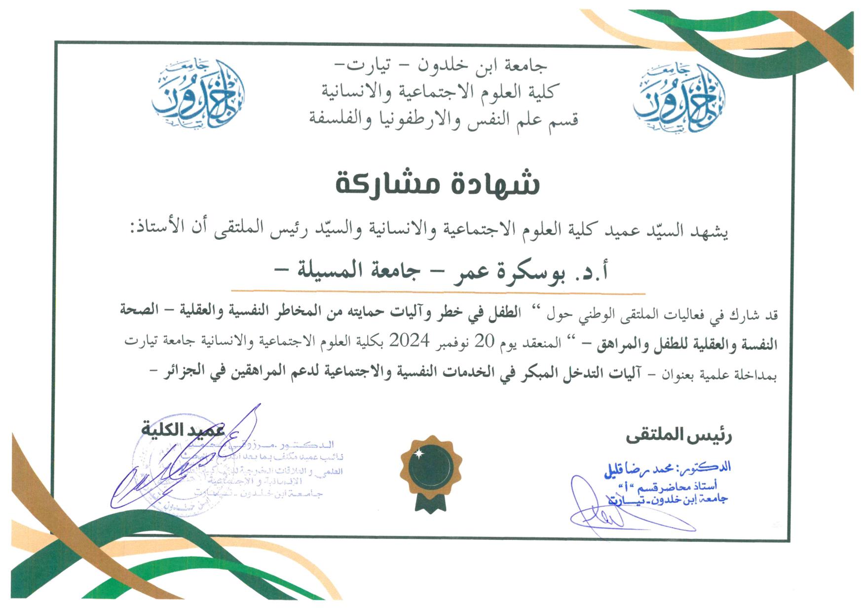 M. BOUSSAKRA Amar, (2023-12-06), "التنمر المدرسي كمشكلة اجتماعية-التداعيات والحلول", [national] الملتقى الوطني حول: " مشكلات الطفل المتمدرس في ظل التغيرات الراهنة" من تنظيم كلية العلوم الإنسانية الاجتماعية- جامعة ابن خلدون- تيارت , جامعة ابن خلدون- تيارت