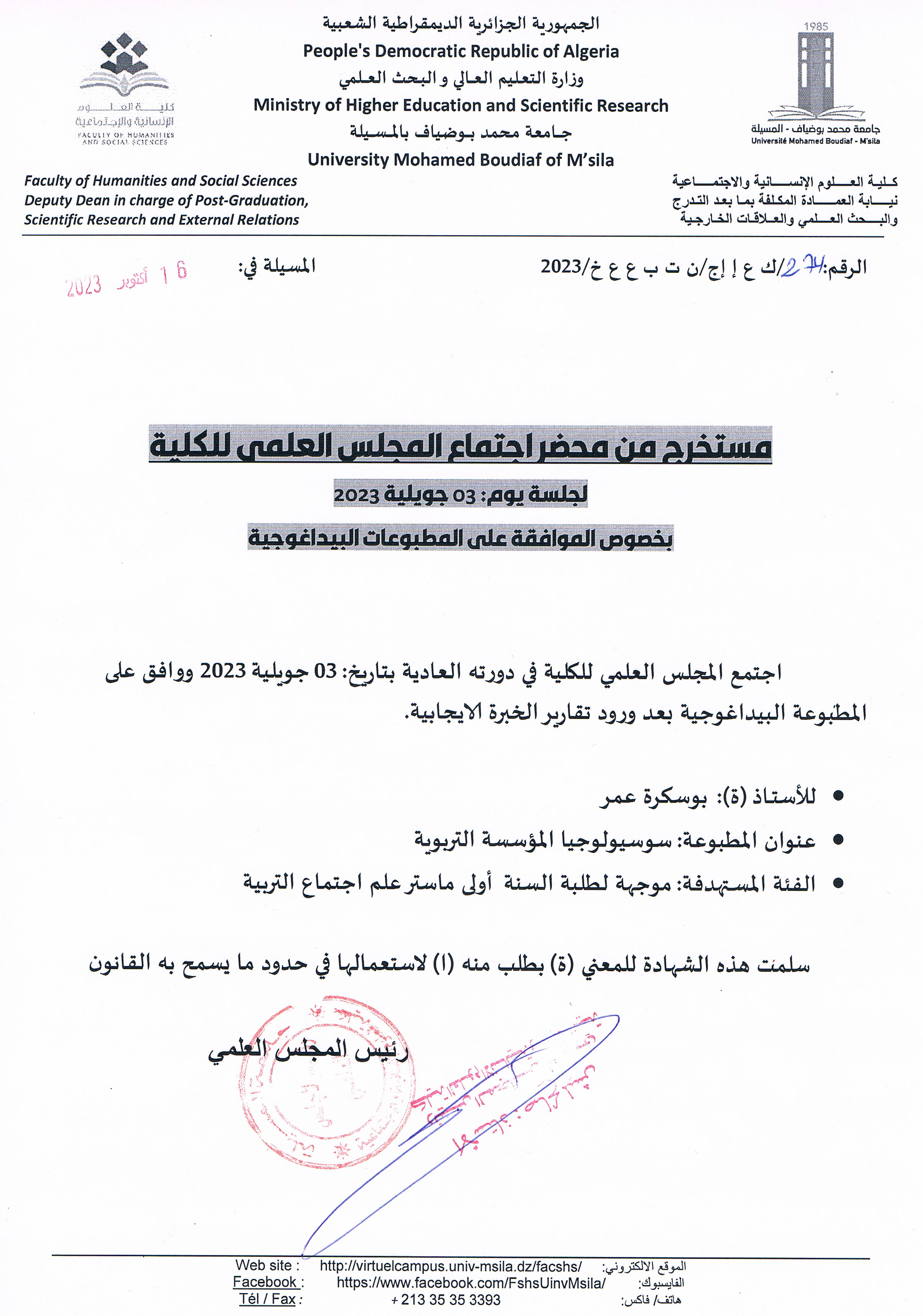 M. BOUSSAKRA Amar, (2023-10-16), "مطبوعة سوسيولوجيا المؤسسة التربوية", [national] المسيلة