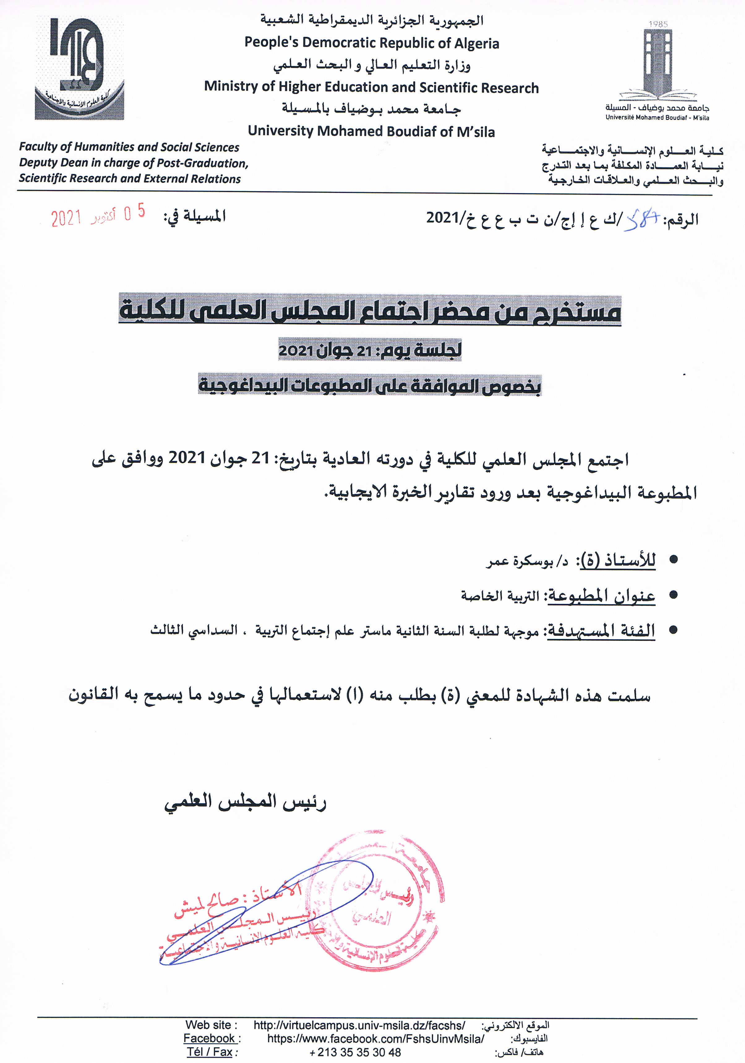 M. BOUSSAKRA Amar, (2021-10-05), "مطبوعة التربية الخاصة", [national] جامعة المسيلة