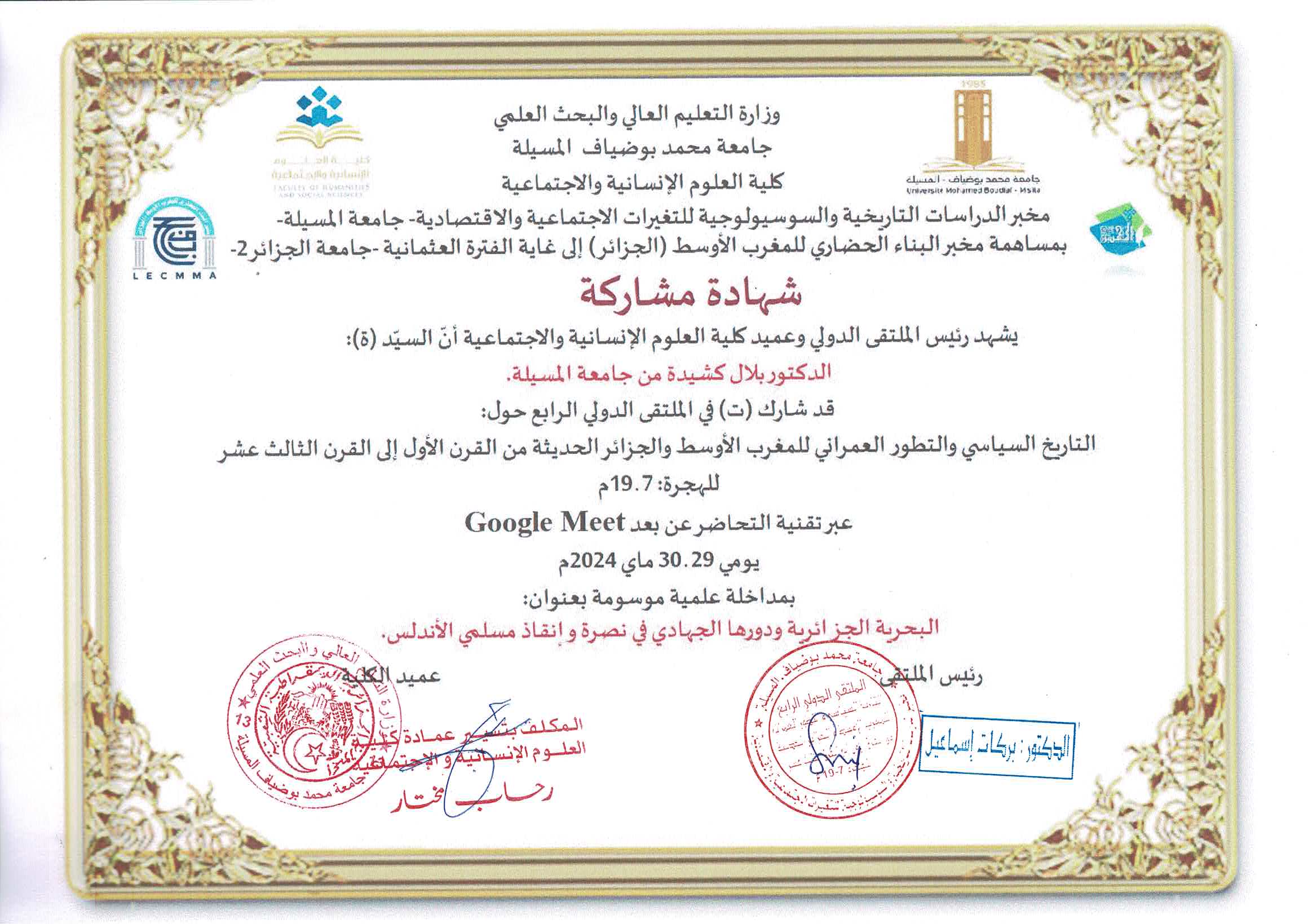 M. KOUCHIDA Bilal, (2024-05-29), "البحرية الجزائرية ودورها الجهادي في نصرة وإنقاد مسلمي الأندلس", [international] التاريخ السياسي والتطور العمراني للمغرب الأوسط والجزائر الحديثة , جامعة محمد بوضياف المسيلة