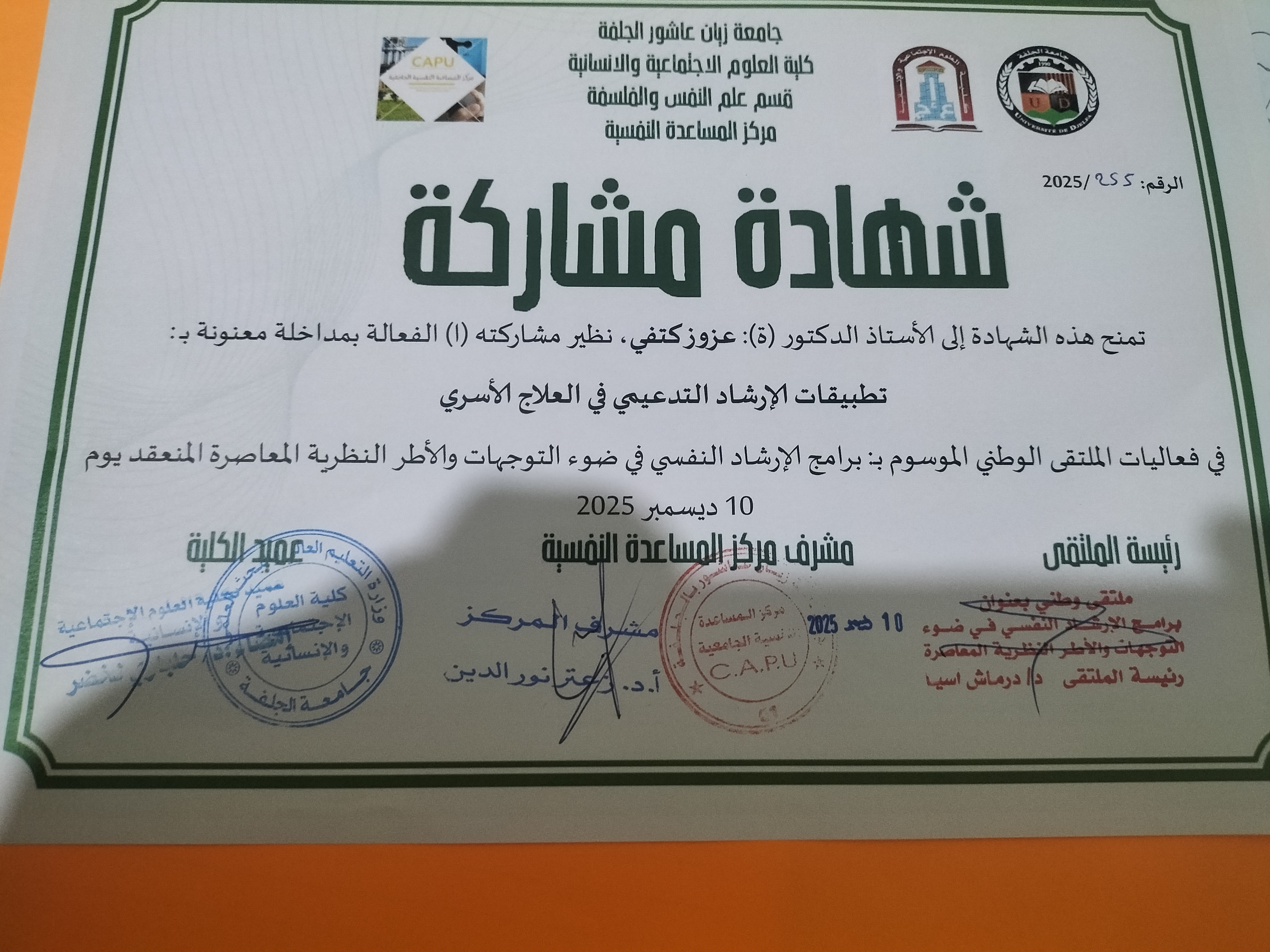 M. KETFI Azzouz, (2025-12-10), "تطبيقات الارشاد التدعيمي في الارشاد الأسري", [national] برامج الارشاد النفسي في ضوء التوجهات والأطر النظرية المعاصرة , قسم علم النفس والفلسفة ومركز المساعدة النفسية بجامعة زيان عاشور بالجلفة