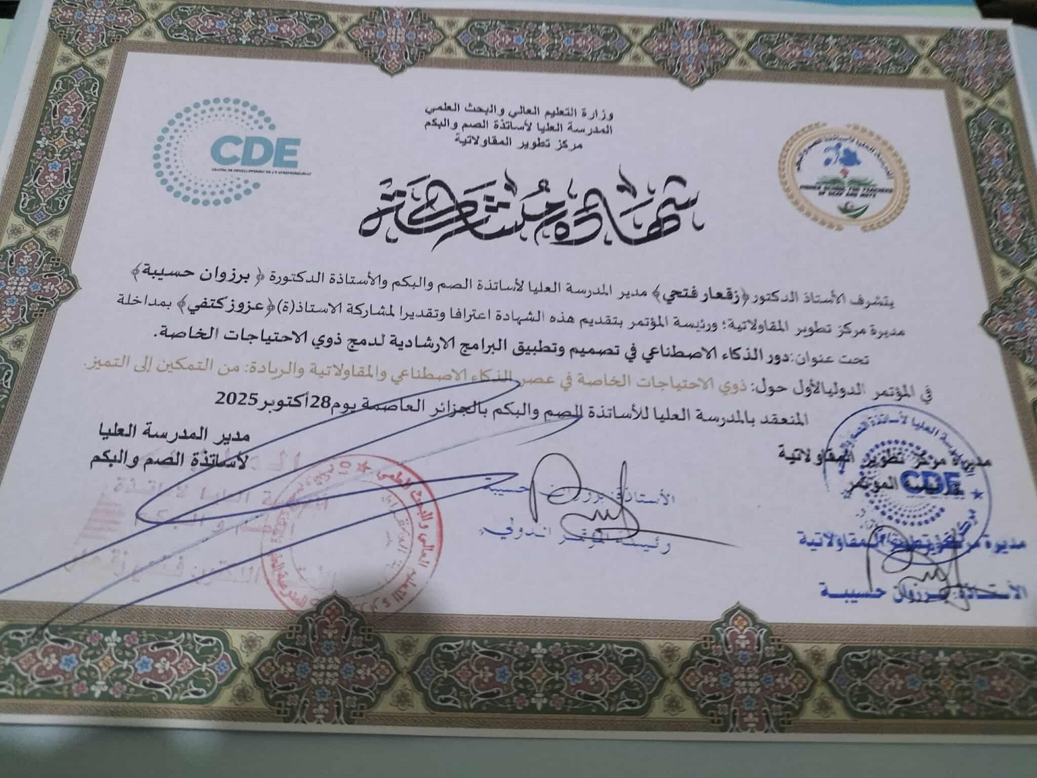 M. KETFI Azzouz, (2025-10-28), "دور الذكاء الاصطناعي في تصميم وتطبيق برامج الارشاد لدمج ذوي الاحتياجات الخاصة", [international] ذوي الاحتياجات الخاصة في عصر الذكاء الاصطناعي , مركز المقاولاتية بوزريعةالمدرسة العليا لأساتذة الصم البكم