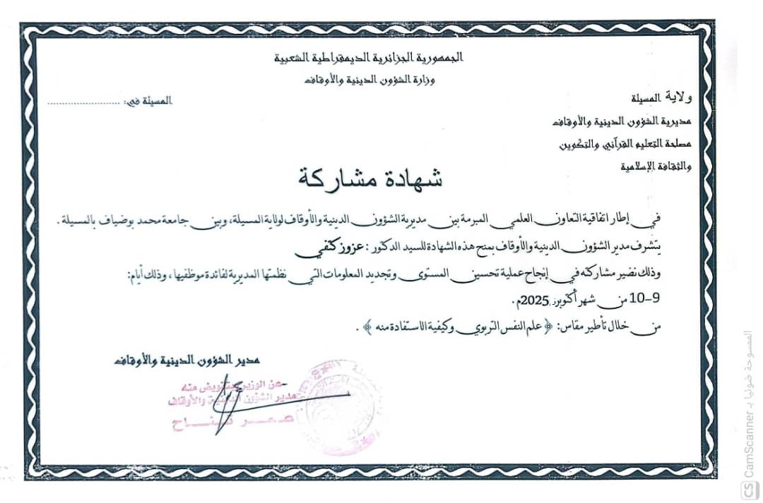 M. KETFI Azzouz, (2019), "ملتقى وطني بعنوان التحول الرقمي التعليمي وفق معايير الجودة العالمية ـ الاعداد والتدريب ـ", [national] كتفي عزوز , جامعة المسيلة