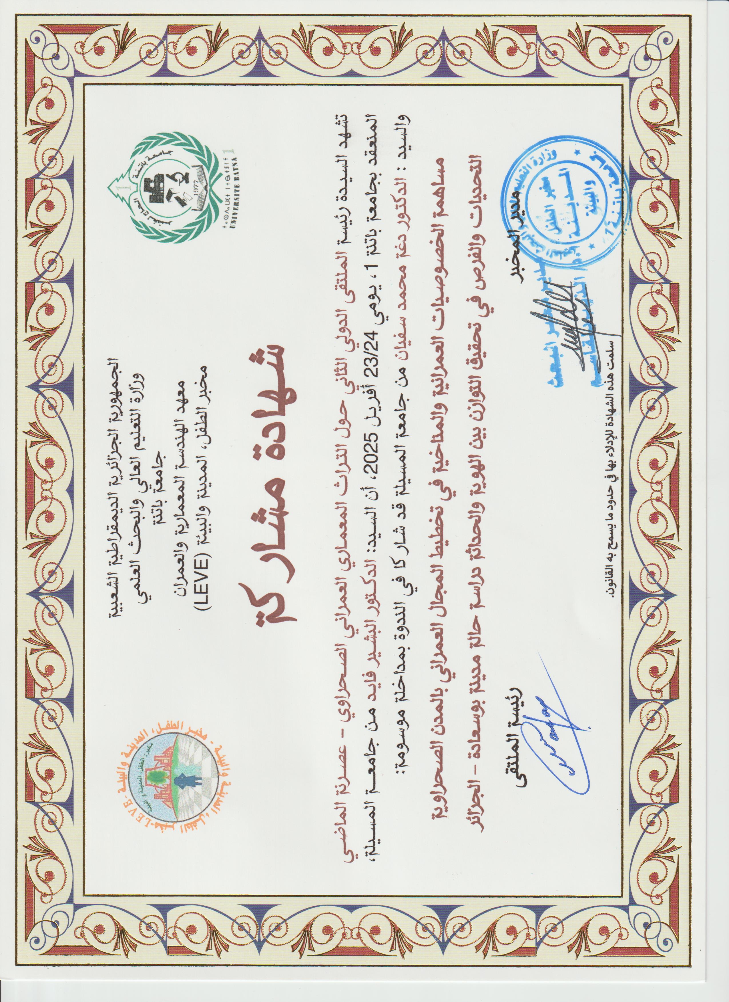 M. FAID Bachir, (2010-12-08), "السكن الاجتماعي الجماعي في المناطق شبه الجافة بين متطلبات التصميم والاستعمال حالة بوسعادة", [international] الملتقى الدولي الثالث حول تسيير المدن , جامعة المسيلة