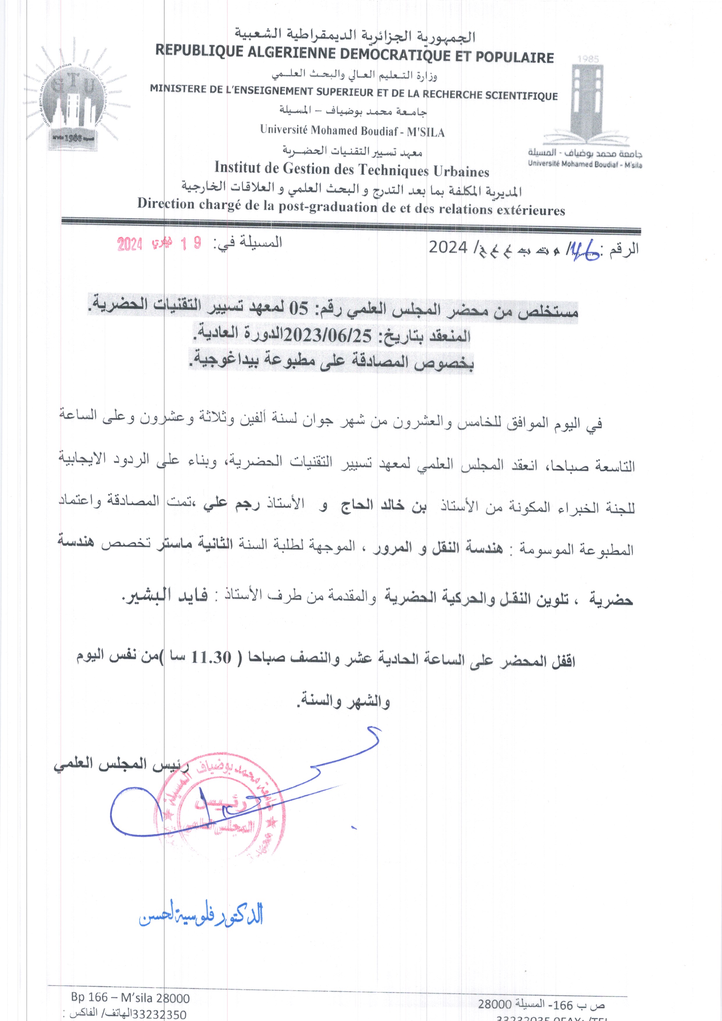 M. FAID Bachir, (2024-07-14), "The Reality of Traffic Safety Management and Implementation Procedures in Algerian Cities : The Case of the City of M'sila", [national] Dogha Mohamed Soufiane , Journal of Harbin Engineering University