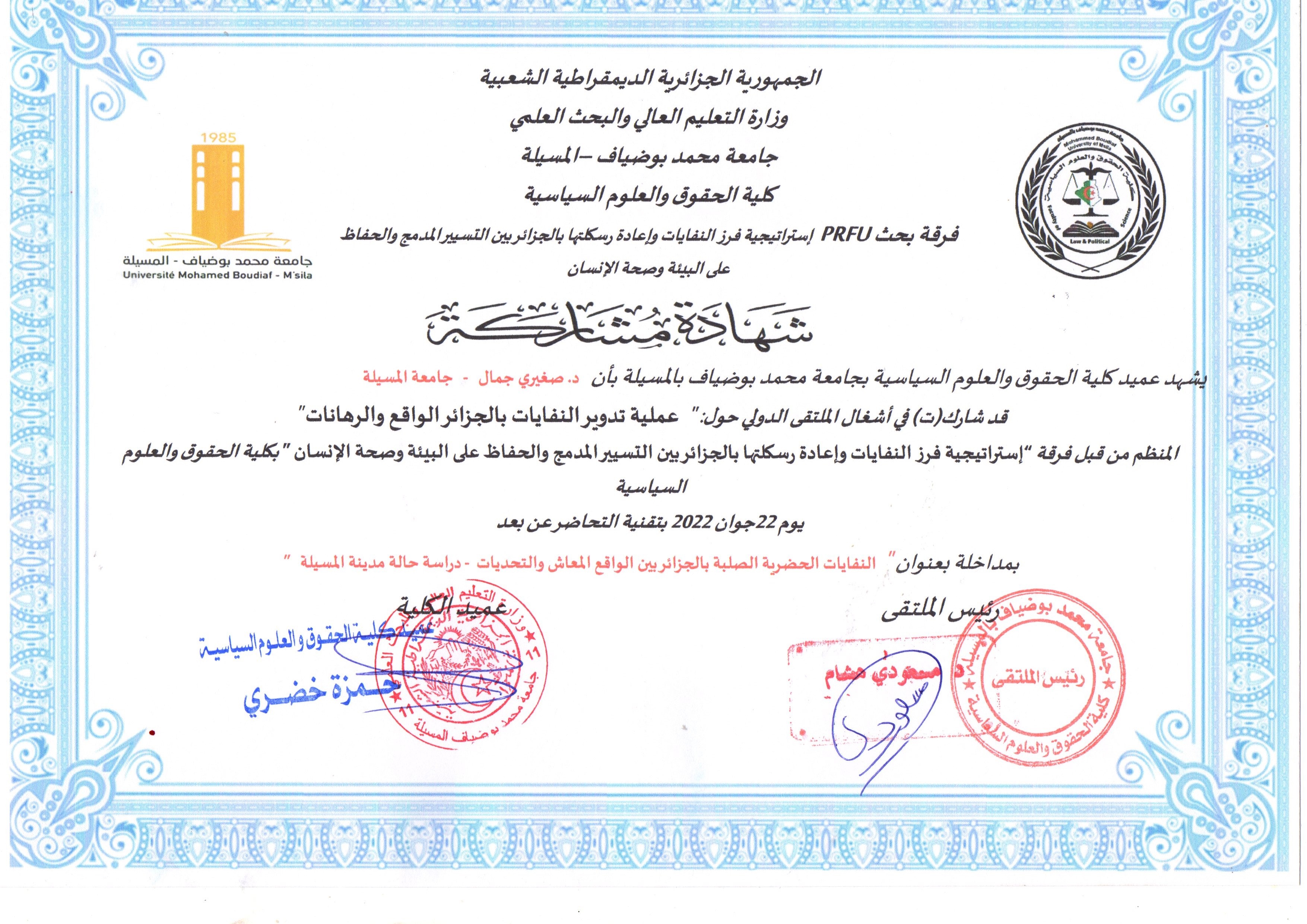 M. SEGHIRI Djamel, (2022-06-22), "النفايات الحضرية الصلبة بالجزائر بين الوقع المعاش والتحديات حالة مدينة المسيلة", [international] الملتقى الدولي حول البيئة , كلية العلوم القانونية والسياسية، جامعة المسيلة