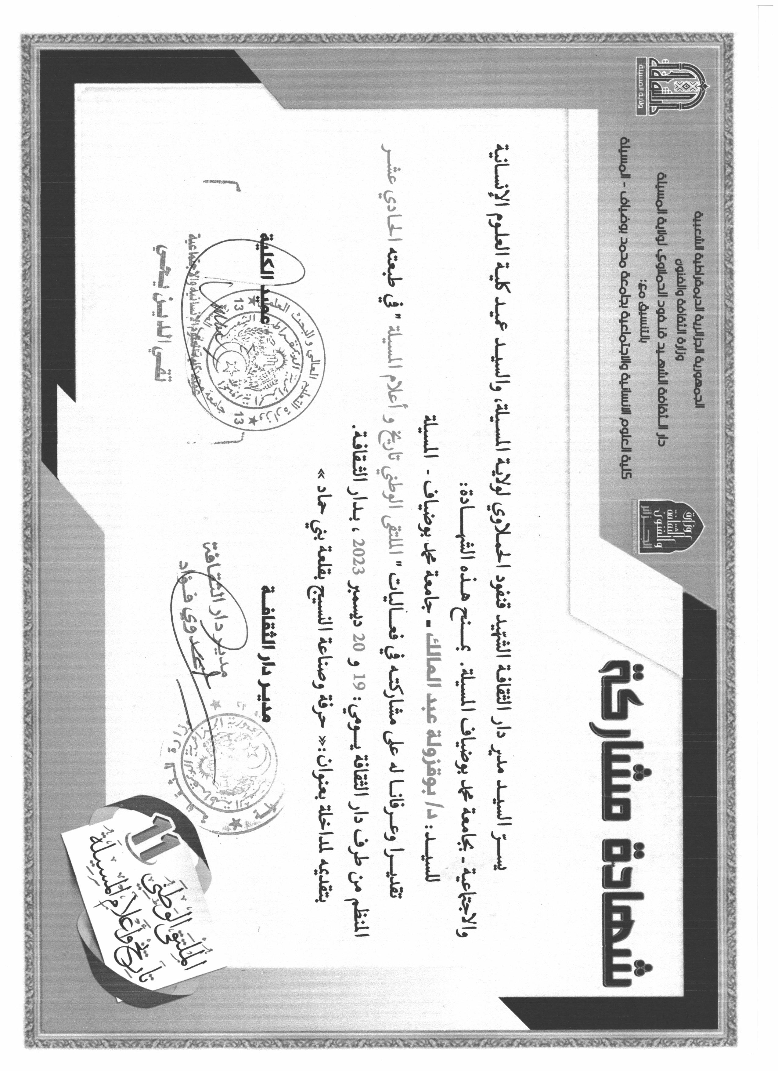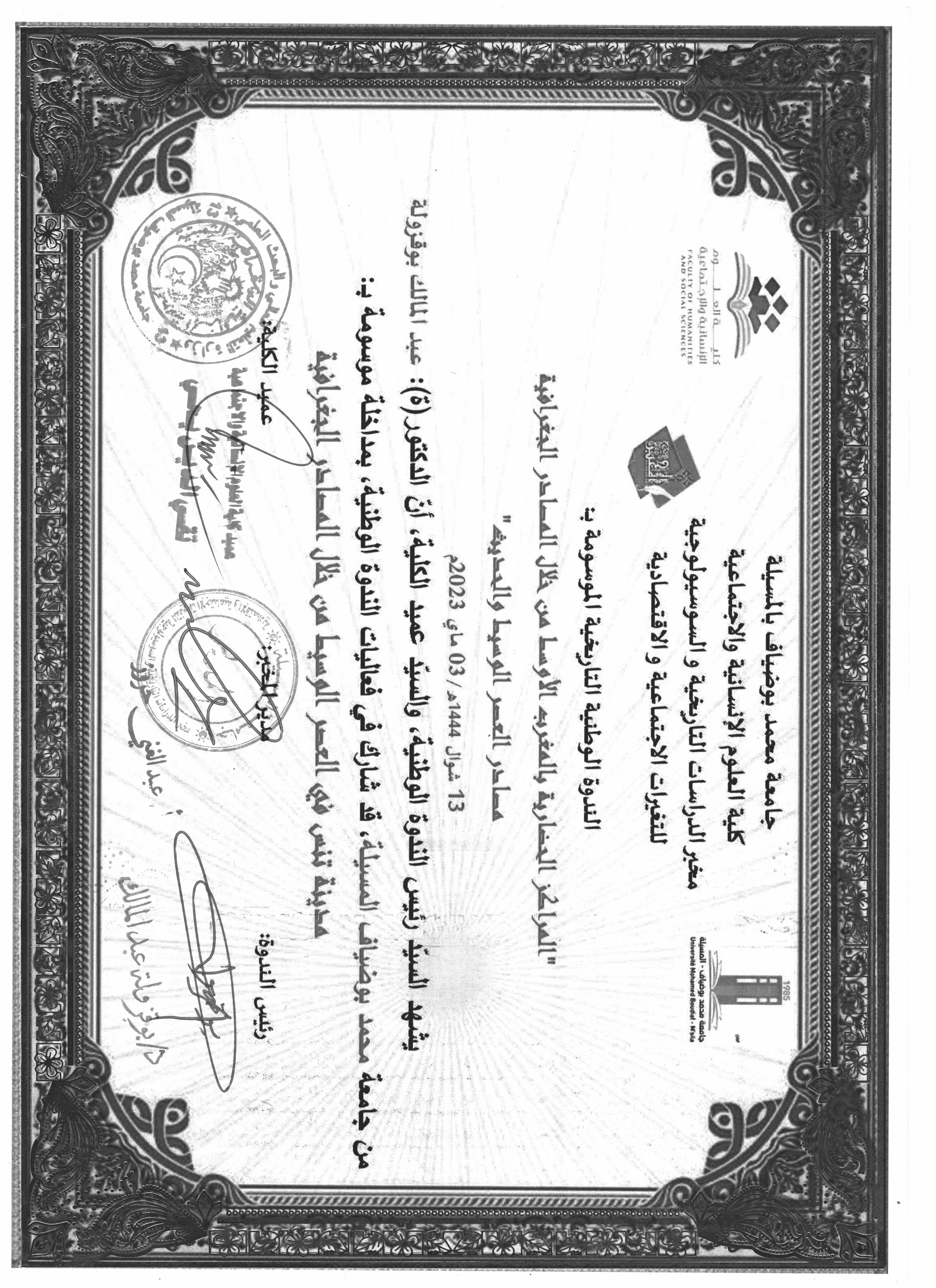 M. BOUKAZOULA Abdelmalek, (2023), "حرفة و صناعة النسيج بالمسيلةتاريخ و ابداع", [national] واقع الحرف اليدوية و الصناعات التقليدية ببوسعادة و سبل استثمارها في المجال السياحي , جامعة المسيلة