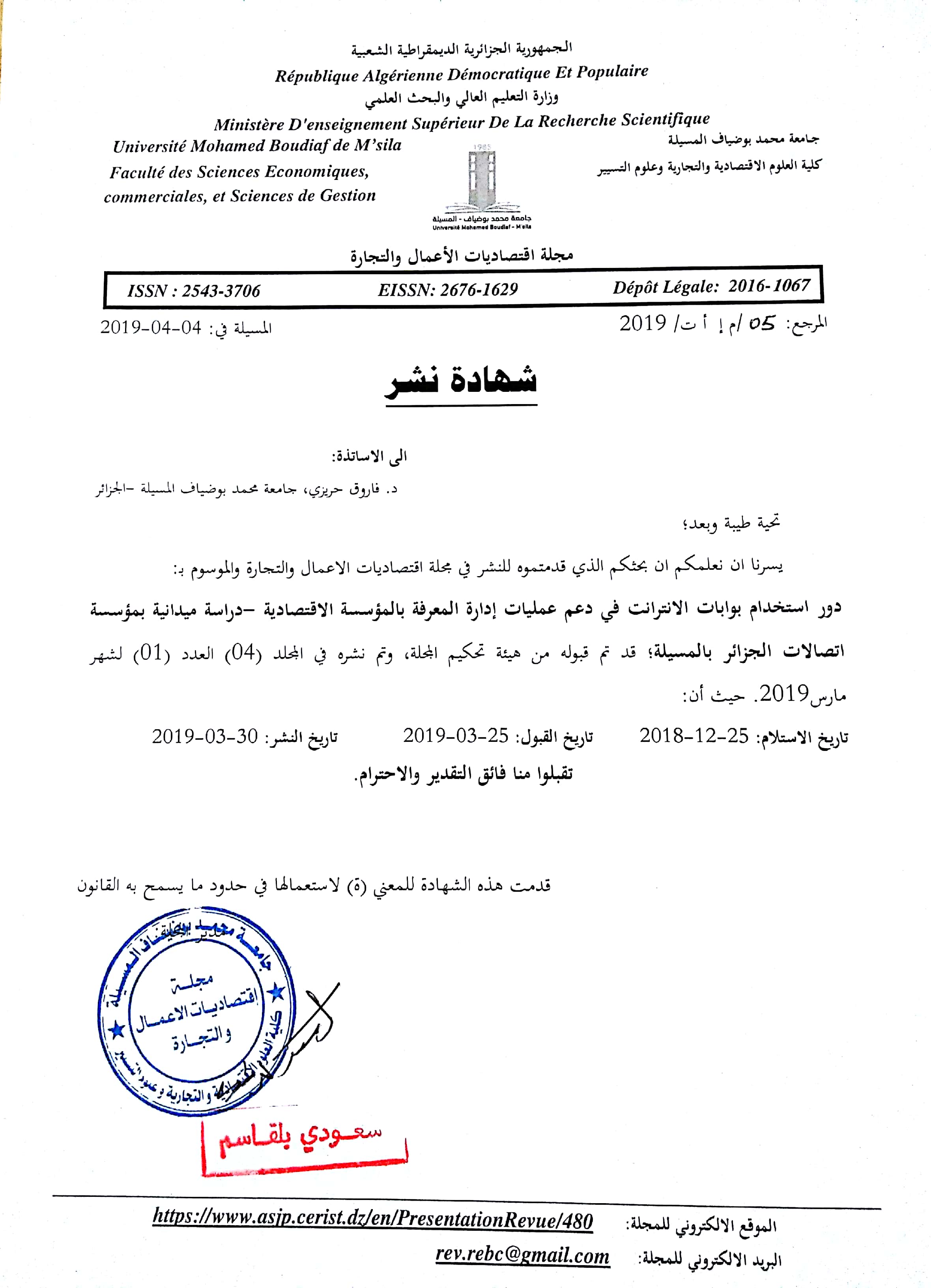 M. HERIZI Farouk, (2019), "دور استخدام بوابات الانترانت في دعم عمليات إدارة المعرفة بالمؤسسة الاقتصادية دراسة ميدانية بمؤسسة اتصالات الجزائر بالمسيلة", [national] مجلة إقتصاديات التجارة , مجلة إقتصاديات التجارة