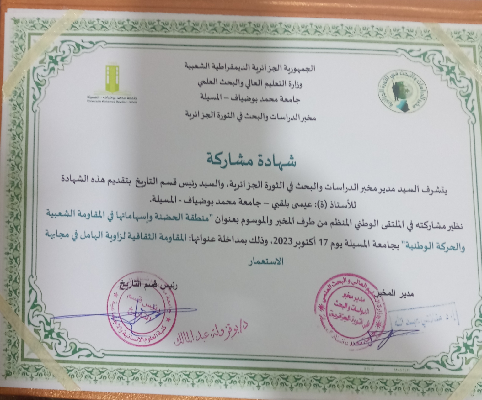 M. BENKOBBI Aissa, (2023-10-17), "المقاومة الثقافية لزاوية الهامل في محابهة", [national] منطقة الحضنة , جامعة المسيلة