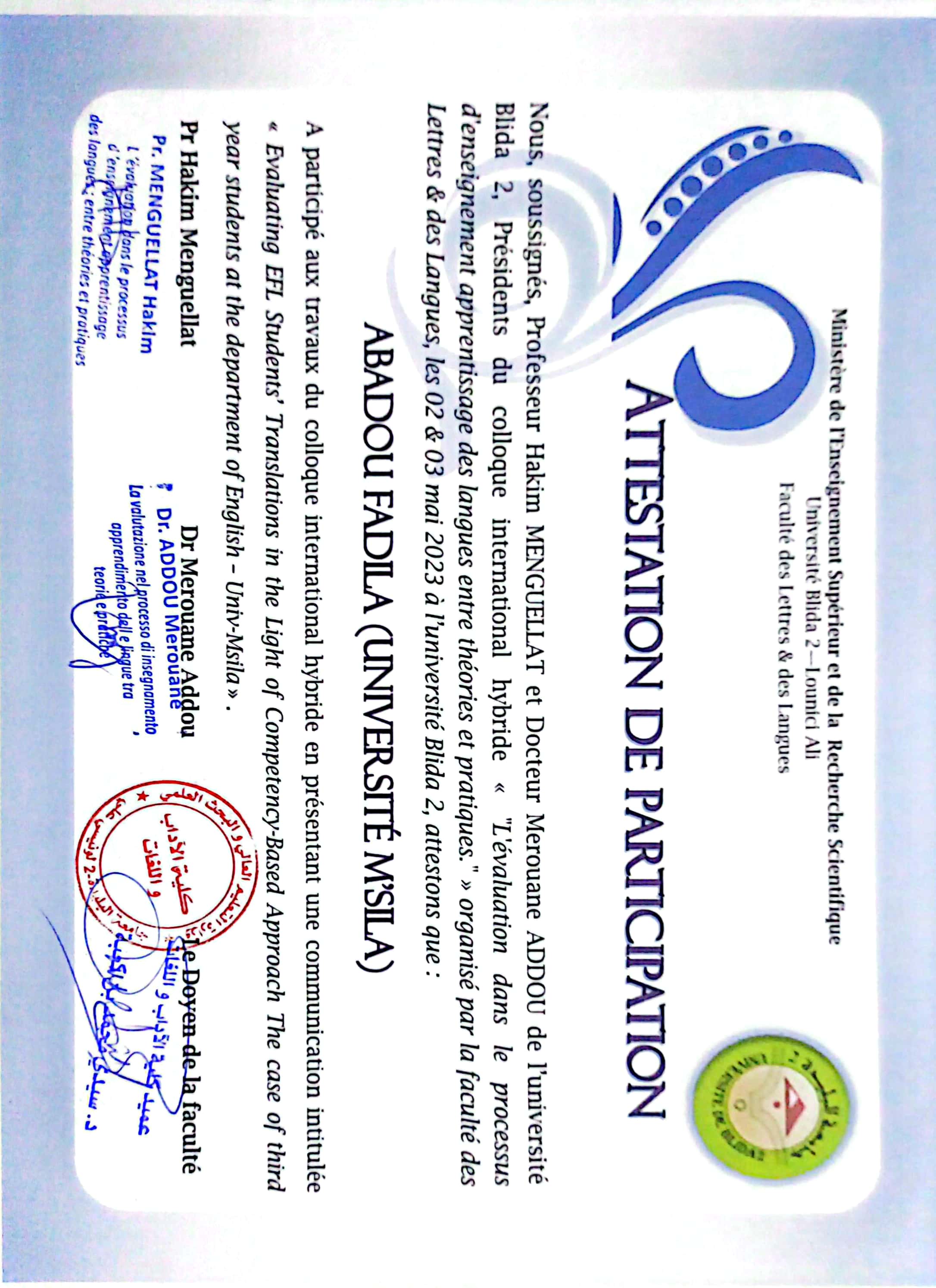 M. ABADOU Fadhila, (2023-05-02), "“Evaluating EFL Students’ Translations in the Light of Competency-Based Approach The case of third year students at the department of English – Univ-Msila.”", [international] L'évaluation dans le processus d'enseignement apprentissage des langues entre théories et pratiques. , university of Blida 2