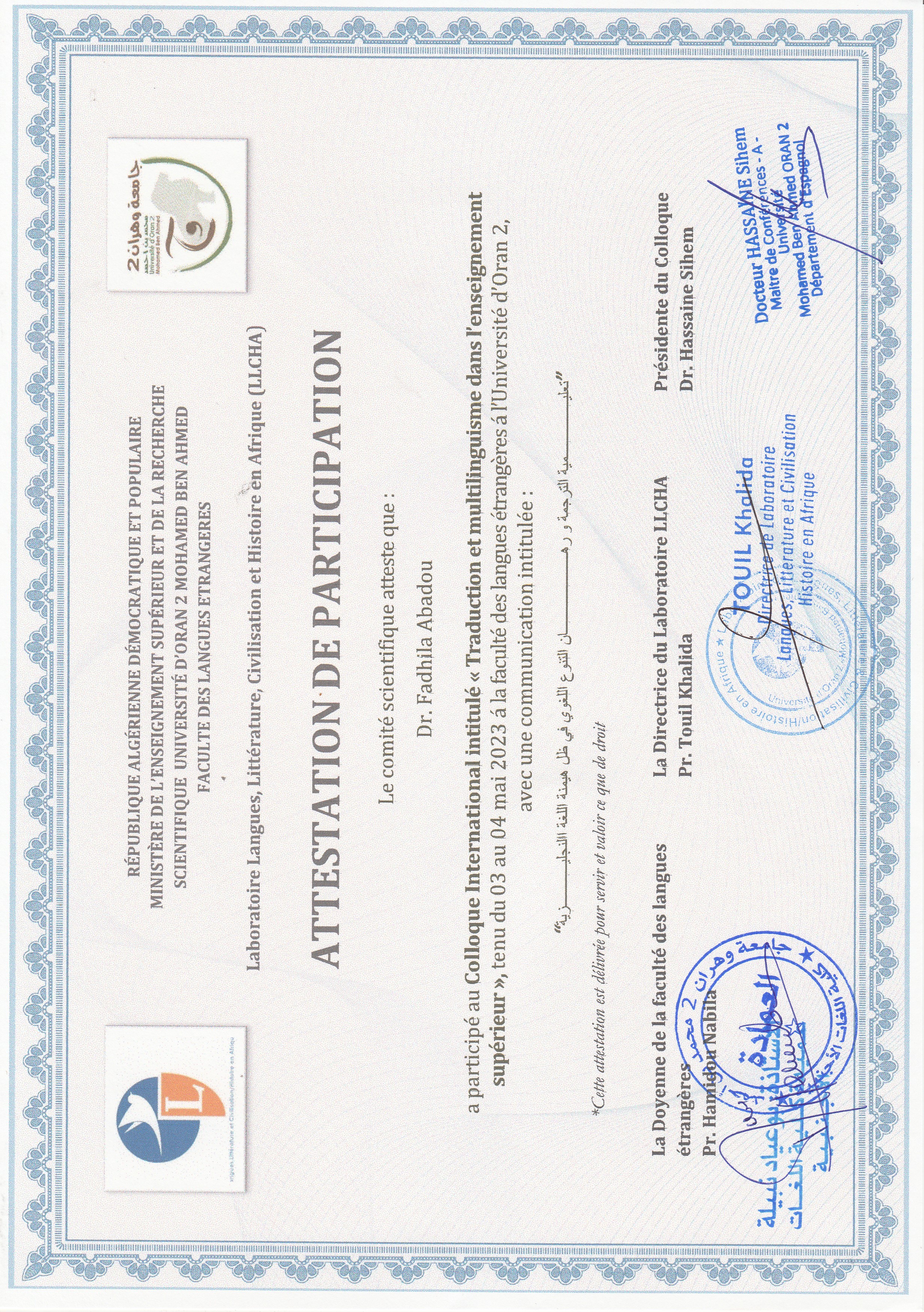 M. ABADOU Fadhila, (2022-12-12), "اللغة العربية والتحدي الترجمي دور التّرجمة في إعادة بعث اللغة العربية في الوسط الجامعي", [national] واقعُ اللّغة العربيّة في الجزائر وتحدِّياتُ العصر الحديث , Centre de Recherche en Science Islamique et Civilisation - Laghouat. algerie , مركز البحث في العلوم الإسلامية و الحضارة بالأغواط (الجزائر)