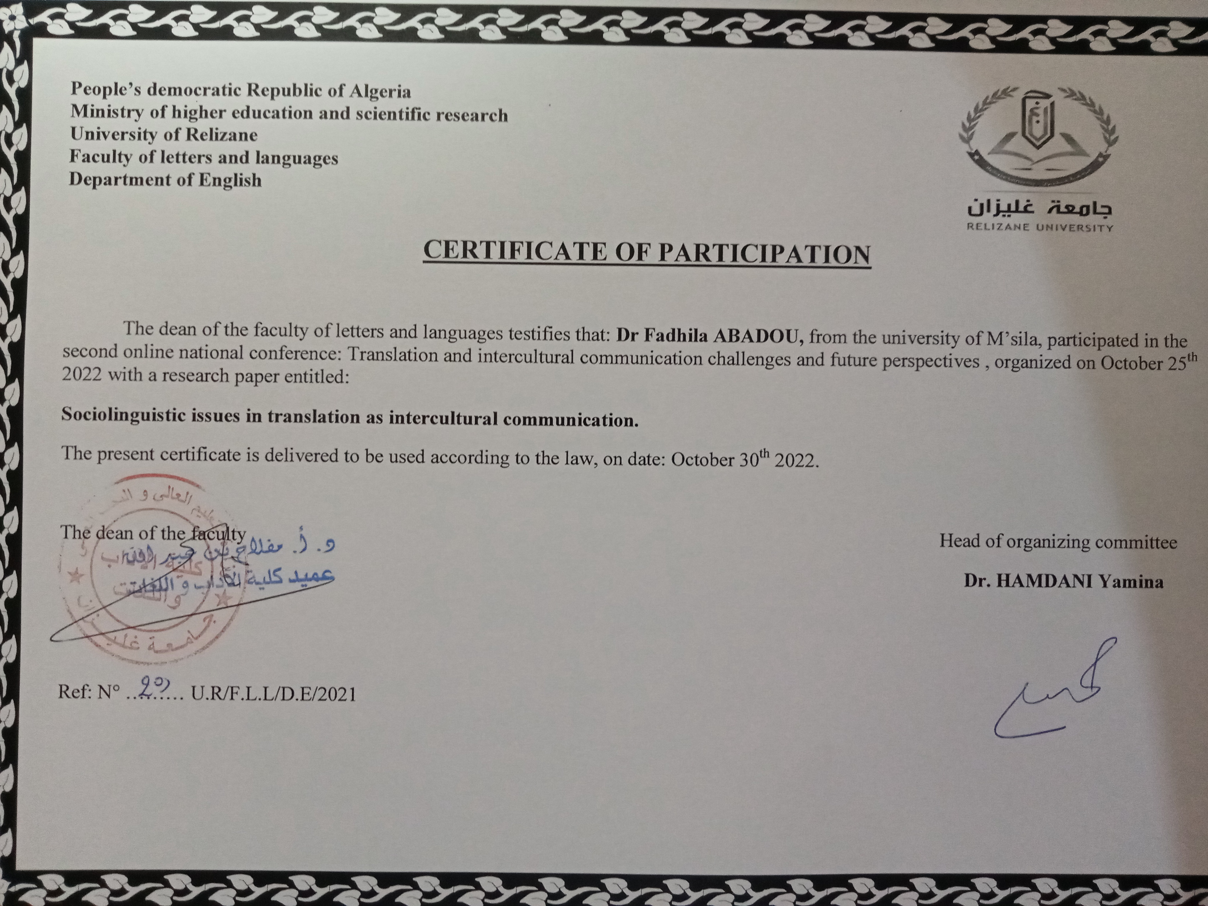 M. ABADOU Fadhila, (2022-10-25), "Sociolinguistic Issues in Translation as Intercultural Communication", [national] Translation and Intercultural Communication: Challenges and Future Perspectives , University of Relizane